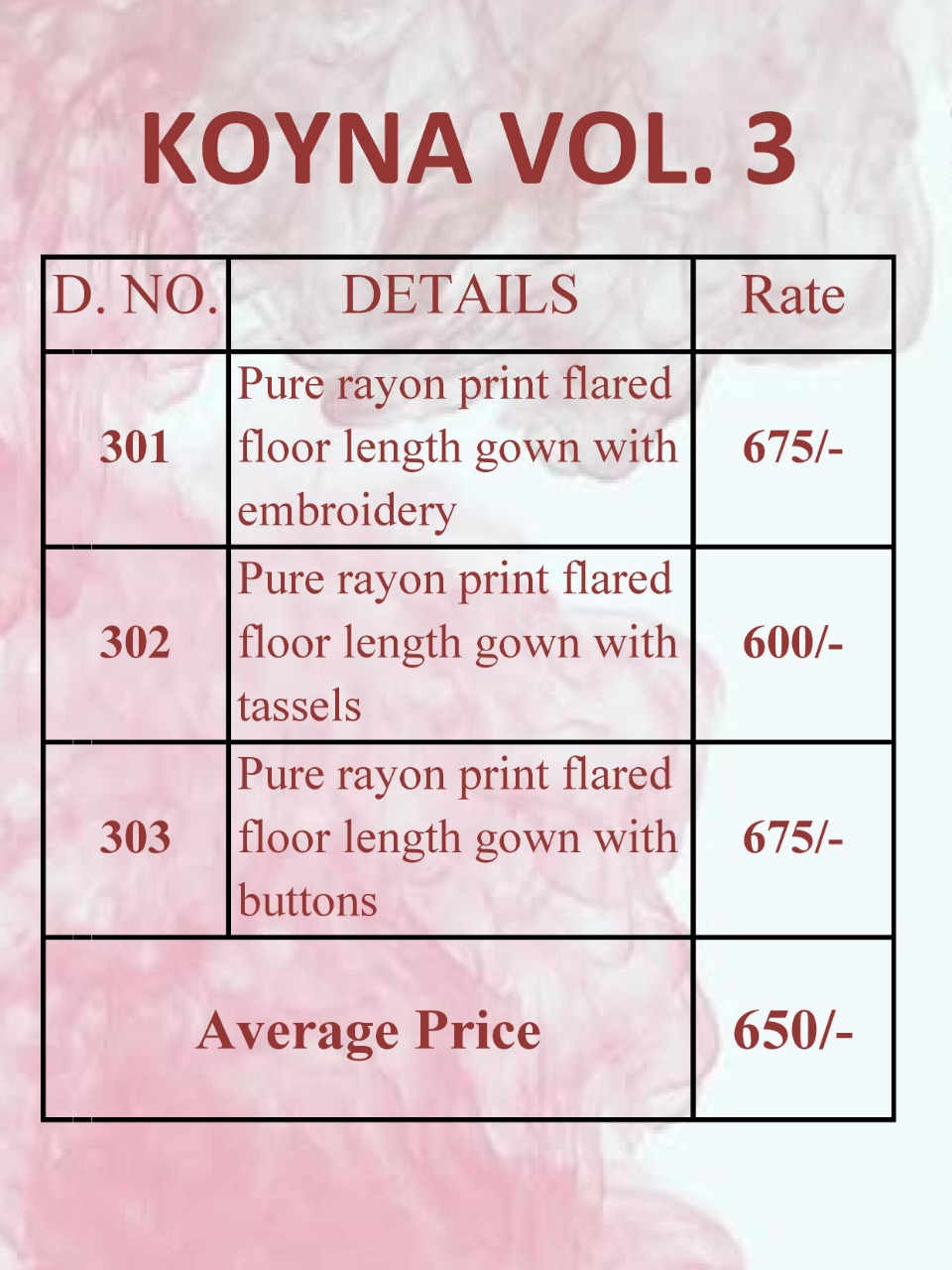 Buy Online Koyna Vol 3 By Fashion Khoj 301 Series Fancy Pure Reyon Kurti Catlog Wholesale Dealer Surat 3 Pcs of Full Catalogue at Wholesale Price. Looking for Koyna Vol 3 By Fashion Khoj 301 Series Fancy Pure Reyon Kurti Catlog Wholesale Dealer Surat Full Catalouge at Best Price? Buy Now Koyna Vol 3 By Fashion Khoj 301 Series Fancy Pure Reyon Kurti Catlog Wholesale Dealer Surat at Wholesale Rate of Rs 1950 with Total 3 Pcs from authroized dealer and supplier of Brand. Cost of Each piece is just only Rs 650 which is very low and affordable price to resale the product in your retail store ,This is Surat based Wholesale Supplier & Dealer of Brand. Click on Brand name to Know more about Brand's products.Call or Whatsapp on 9898838984 for booking or enquiry