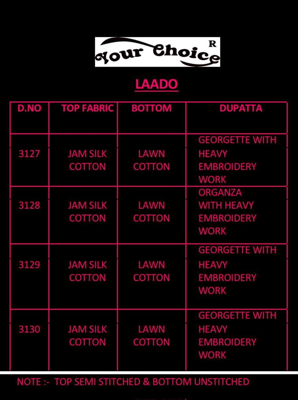 Buy Online Laado By Your Choice Series 3137 To 3130 Jam Silk Cotton Suits Wholesale Supplier Gujarat 4 Pcs of Full Catalogue at Wholesale Price. Looking for Laado By Your Choice Series 3137 To 3130 Jam Silk Cotton Suits Wholesale Supplier Gujarat Full Catalouge at Best Price? Buy Now Laado By Your Choice Series 3137 To 3130 Jam Silk Cotton Suits Wholesale Supplier Gujarat at Wholesale Rate of Rs 5580 with Total 4 Pcs from authroized dealer and supplier of YOUR CHOICE Brand. Cost of Each piece is just only Rs 1395 which is very low and affordable price to resale the product in your retail store ,This is Surat based Wholesale Supplier & Dealer of YOUR CHOICE Brand. Click on Brand name to Know more about YOUR CHOICE Brand's products.Call or Whatsapp on 9898838984 for booking or enquiry