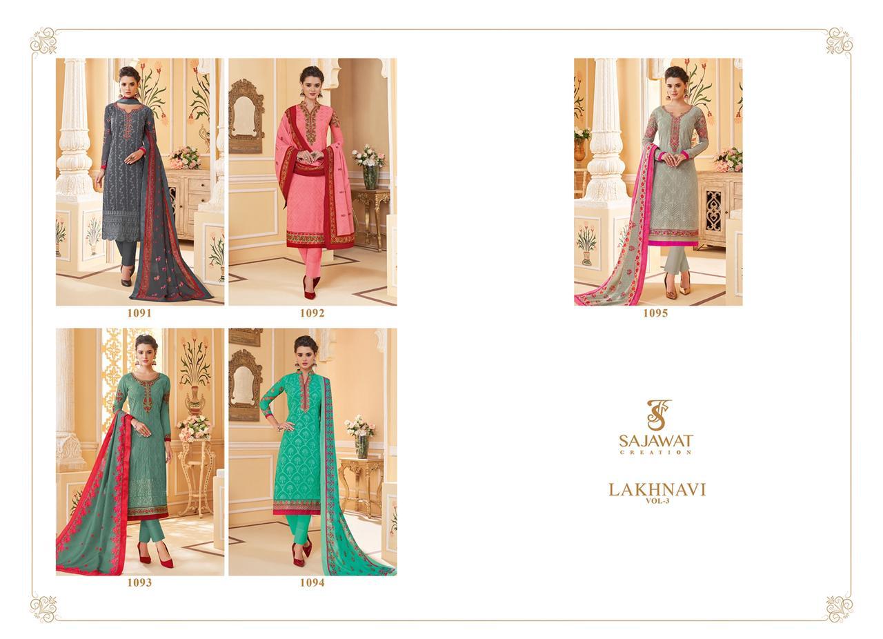 Buy Online Lakhanavi Vol 03 By Sajawat Creation Designer Suits Set And Single Wholesale Supplier And Dealer Gujarat 5 Pcs of Full Catalogue at Wholesale Price. Looking for Lakhanavi Vol 03 By Sajawat Creation Designer Suits Set And Single Wholesale Supplier And Dealer Gujarat Full Catalouge at Best Price? Buy Now Lakhanavi Vol 03 By Sajawat Creation Designer Suits Set And Single Wholesale Supplier And Dealer Gujarat at Wholesale Rate of Rs 5775 with Total 5 Pcs from authroized dealer and supplier of SAJAWAT Brand. Cost of Each piece is just only Rs 1155 which is very low and affordable price to resale the product in your retail store ,This is Surat based Wholesale Supplier & Dealer of SAJAWAT Brand. Click on Brand name to Know more about SAJAWAT Brand's products.Call or Whatsapp on 9898838984 for booking or enquiry