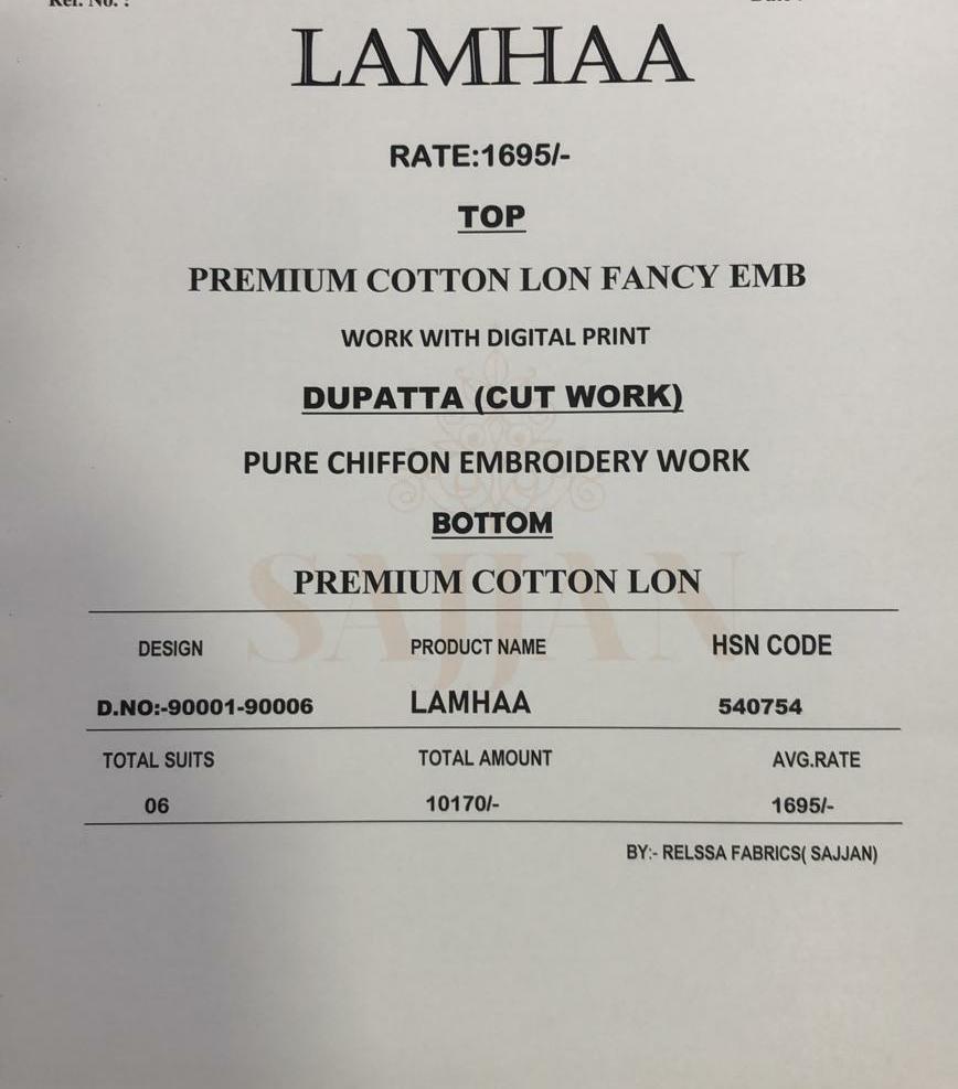 Buy Online Lamhaa By Relisaa Wholesaler Supplier From Surat 6 Pcs of Full Catalogue at Wholesale Price. Looking for Lamhaa By Relisaa Wholesaler Supplier From Surat Full Catalouge at Best Price? Buy Now Lamhaa By Relisaa Wholesaler Supplier From Surat at Wholesale Rate of Rs 10170 with Total 6 Pcs from authroized dealer and supplier of Brand. Cost of Each piece is just only Rs 1695 which is very low and affordable price to resale the product in your retail store ,This is Surat based Wholesale Supplier & Dealer of Brand. Click on Brand name to Know more about Brand's products.Call or Whatsapp on 9898838984 for booking or enquiry
