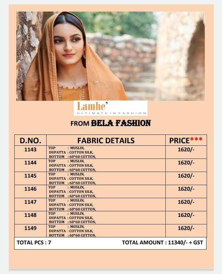 Buy Online Lamhe By Bela Series 1143 To 1149 Designer Party Wear Suits Wholesale Supplier Gujarat 7 Pcs of Full Catalogue at Wholesale Price. Looking for Lamhe By Bela Series 1143 To 1149 Designer Party Wear Suits Wholesale Supplier Gujarat Full Catalouge at Best Price? Buy Now Lamhe By Bela Series 1143 To 1149 Designer Party Wear Suits Wholesale Supplier Gujarat at Wholesale Rate of Rs 11340 with Total 7 Pcs from authroized dealer and supplier of BELA Brand. Cost of Each piece is just only Rs 1620 which is very low and affordable price to resale the product in your retail store ,This is Surat based Wholesale Supplier & Dealer of BELA Brand. Click on Brand name to Know more about BELA Brand's products.Call or Whatsapp on 9898838984 for booking or enquiry