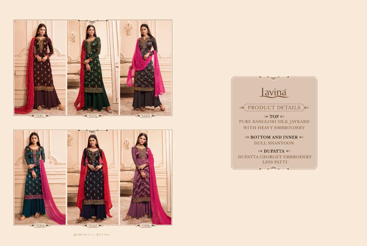 Buy Online Lavina Vol 92 Series 92001 Designer Party Wear Suits Wholesale Supplier Gujarat 6 Pcs of Full Catalogue at Wholesale Price. Looking for Lavina Vol 92 Series 92001 Designer Party Wear Suits Wholesale Supplier Gujarat Full Catalouge at Best Price? Buy Now Lavina Vol 92 Series 92001 Designer Party Wear Suits Wholesale Supplier Gujarat at Wholesale Rate of Rs 10170 with Total 6 Pcs from authroized dealer and supplier of LAVINA Brand. Cost of Each piece is just only Rs 1695 which is very low and affordable price to resale the product in your retail store ,This is Surat based Wholesale Supplier & Dealer of LAVINA Brand. Click on Brand name to Know more about LAVINA Brand's products.Call or Whatsapp on 9898838984 for booking or enquiry