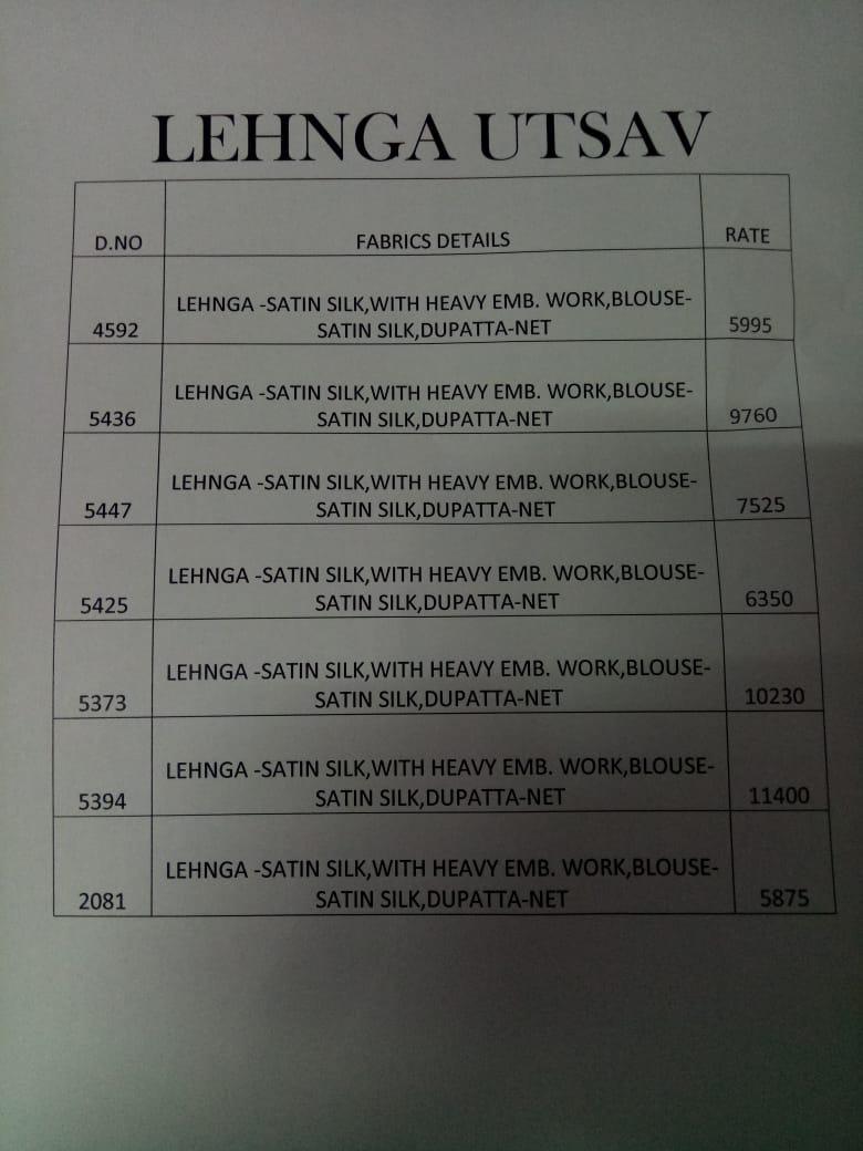 Buy Online Lehnga Utsav By Utsav 4592 Series Designer Bridal Party Wear Lehenga Choli Collection Wholesaler Surat 7 Pcs of Full Catalogue at Wholesale Price. Looking for Lehnga Utsav By Utsav 4592 Series Designer Bridal Party Wear Lehenga Choli Collection Wholesaler Surat Full Catalouge at Best Price? Buy Now Lehnga Utsav By Utsav 4592 Series Designer Bridal Party Wear Lehenga Choli Collection Wholesaler Surat at Wholesale Rate of Rs 0 with Total 7 Pcs from authroized dealer and supplier of Brand. Cost of Each piece is just only Rs 0 which is very low and affordable price to resale the product in your retail store ,This is Surat based Wholesale Supplier & Dealer of Brand. Click on Brand name to Know more about Brand's products.Call or Whatsapp on 9898838984 for booking or enquiry