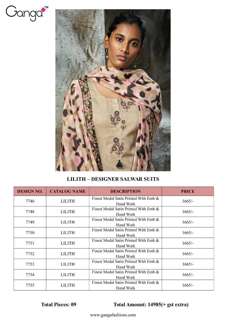 Buy Online Lilith By Ganga Series 7746 To 7755 Satin Printed Suits Wholesale Supplier Gujarat 9 Pcs of Full Catalogue at Wholesale Price. Looking for Lilith By Ganga Series 7746 To 7755 Satin Printed Suits Wholesale Supplier Gujarat Full Catalouge at Best Price? Buy Now Lilith By Ganga Series 7746 To 7755 Satin Printed Suits Wholesale Supplier Gujarat at Wholesale Rate of Rs 14985 with Total 9 Pcs from authroized dealer and supplier of GANGA Brand. Cost of Each piece is just only Rs 1665 which is very low and affordable price to resale the product in your retail store ,This is Surat based Wholesale Supplier & Dealer of GANGA Brand. Click on Brand name to Know more about GANGA Brand's products.Call or Whatsapp on 9898838984 for booking or enquiry