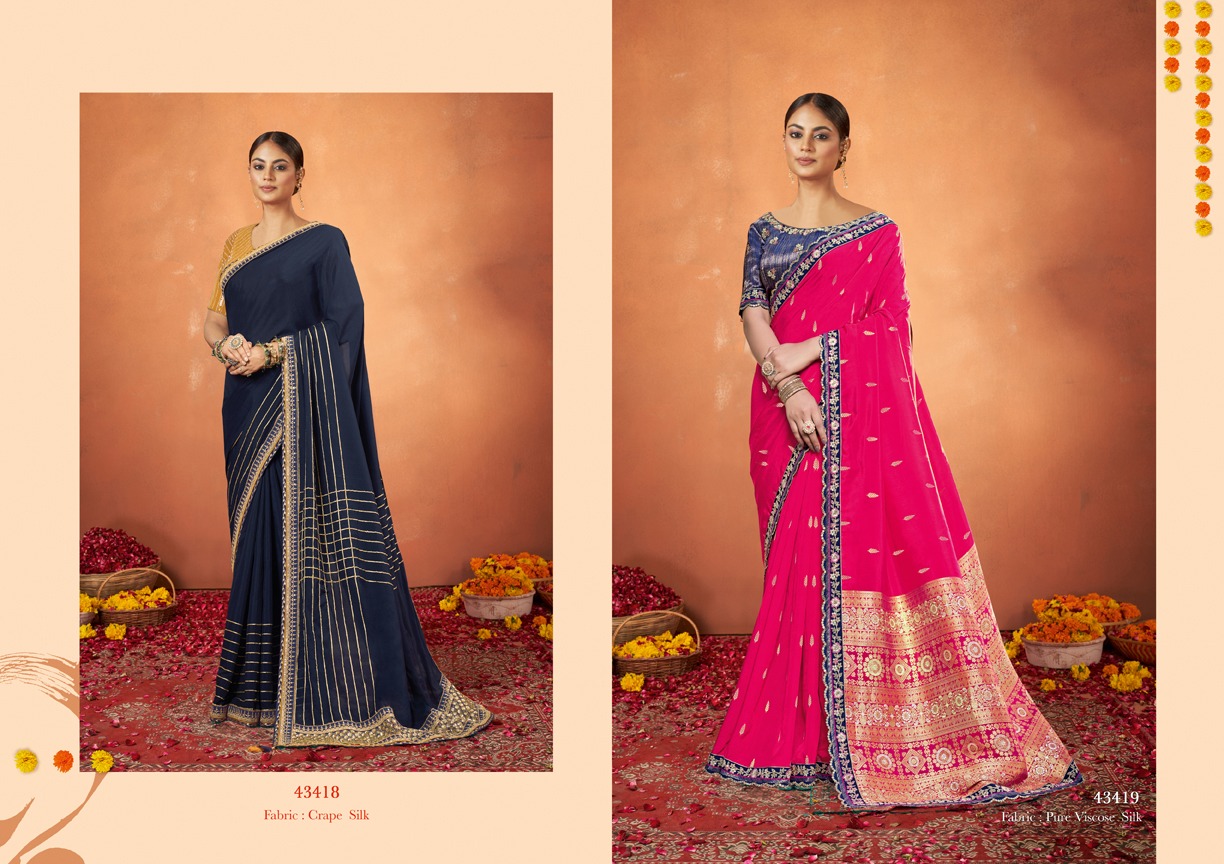 *BRAND NAME : MAHOTSAV* *CATALOG : "NORITA 43400 SERIES-PRADHA* *PRICE :-* *43410-1995/-* *43416-2625/-* *43417-1865/-* *43418-1675/-* *43419-1995/-* *5% GST EXTRA* *SAREE FABRIC -: ATTACHED* *BLOUSE FABRIC:- ATTACHED* *BLOUSE TYPE : UN STITCHED* *SINGLES & SET WISE AVAILABLE ?* SINGLE AVAILABLE 100+single |