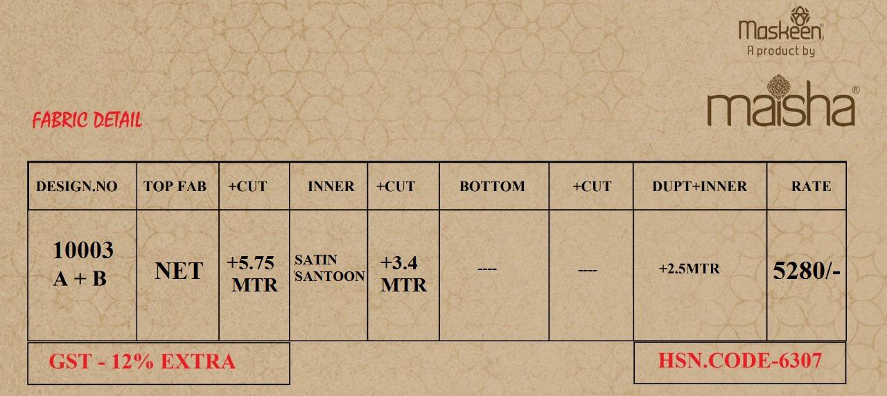 Brand - Maiisa Maskeen. Type - Lehnega . Series -10003 to 10003 A & 10003 B. GST 12 Percent Extra. Delivery 3-4 days Single available |
