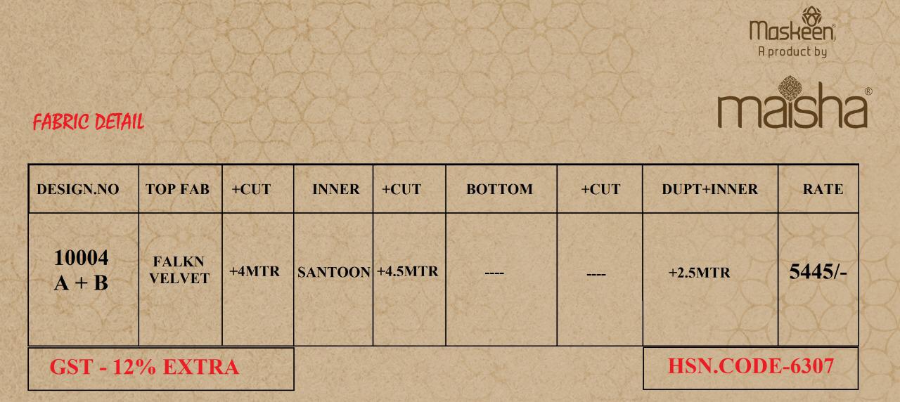 Brand - Maiisa Maskeen. D No . 10004 Colours . Set & Loose. GST 12 Percent Extra. Delivery 2-3 days . Book your order now |