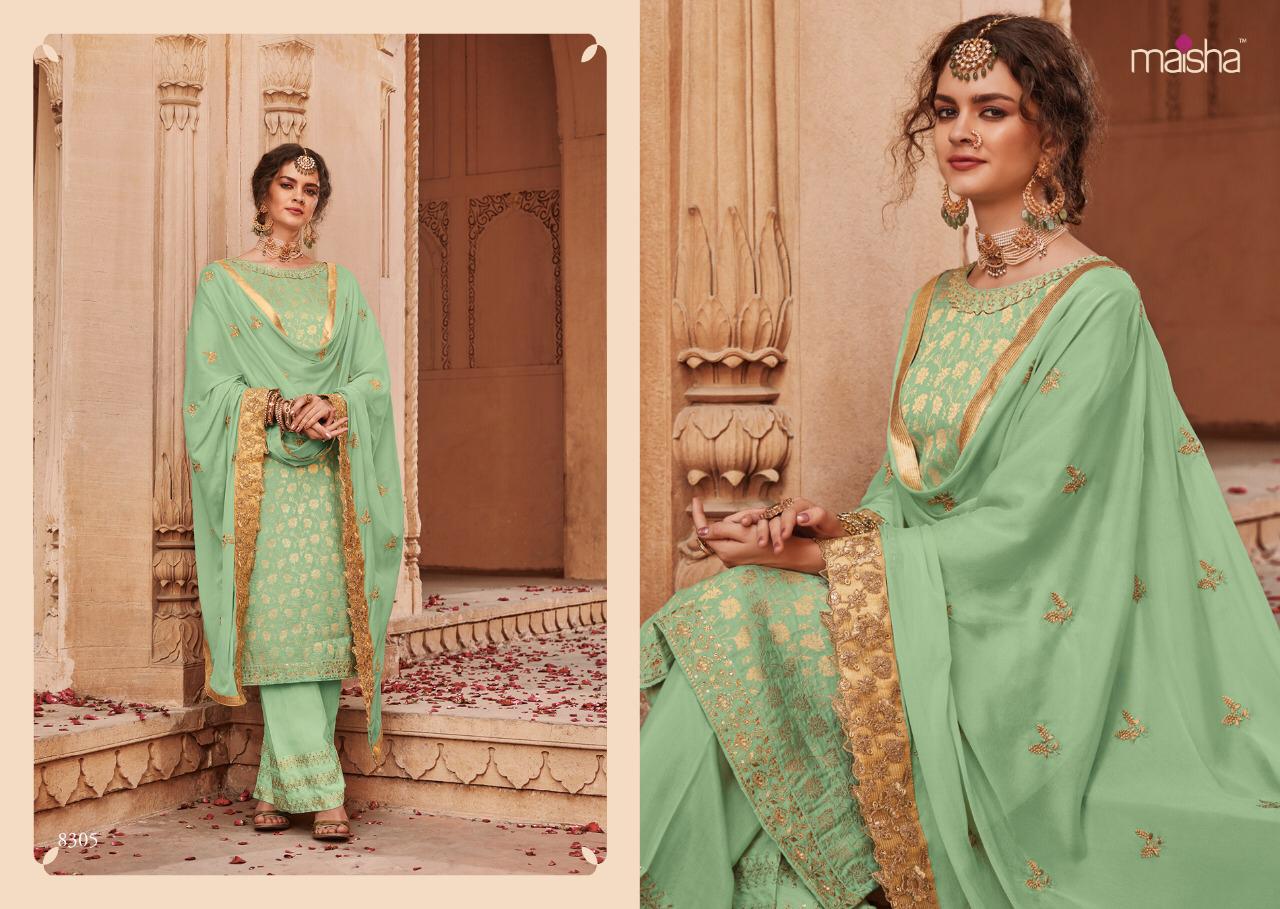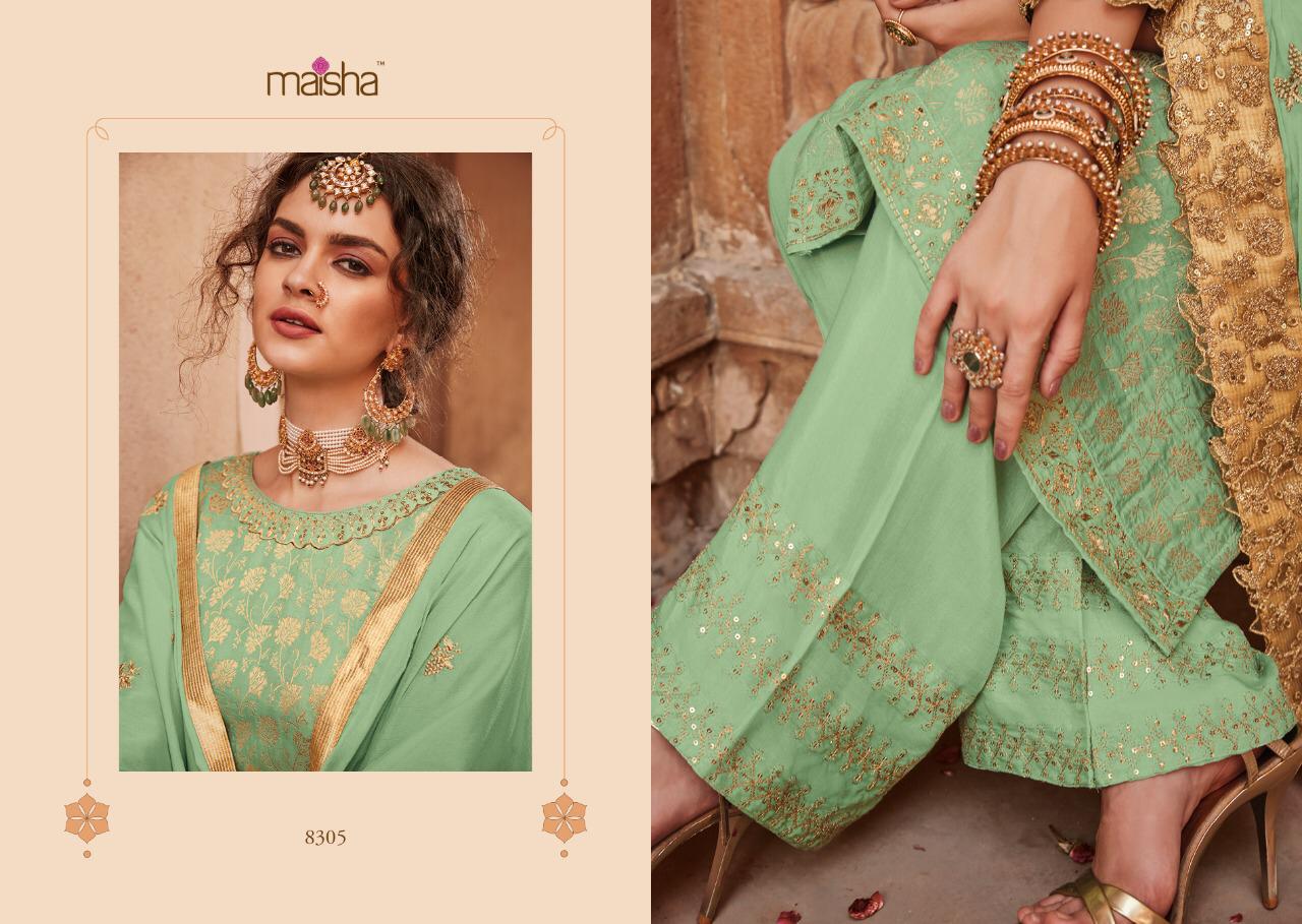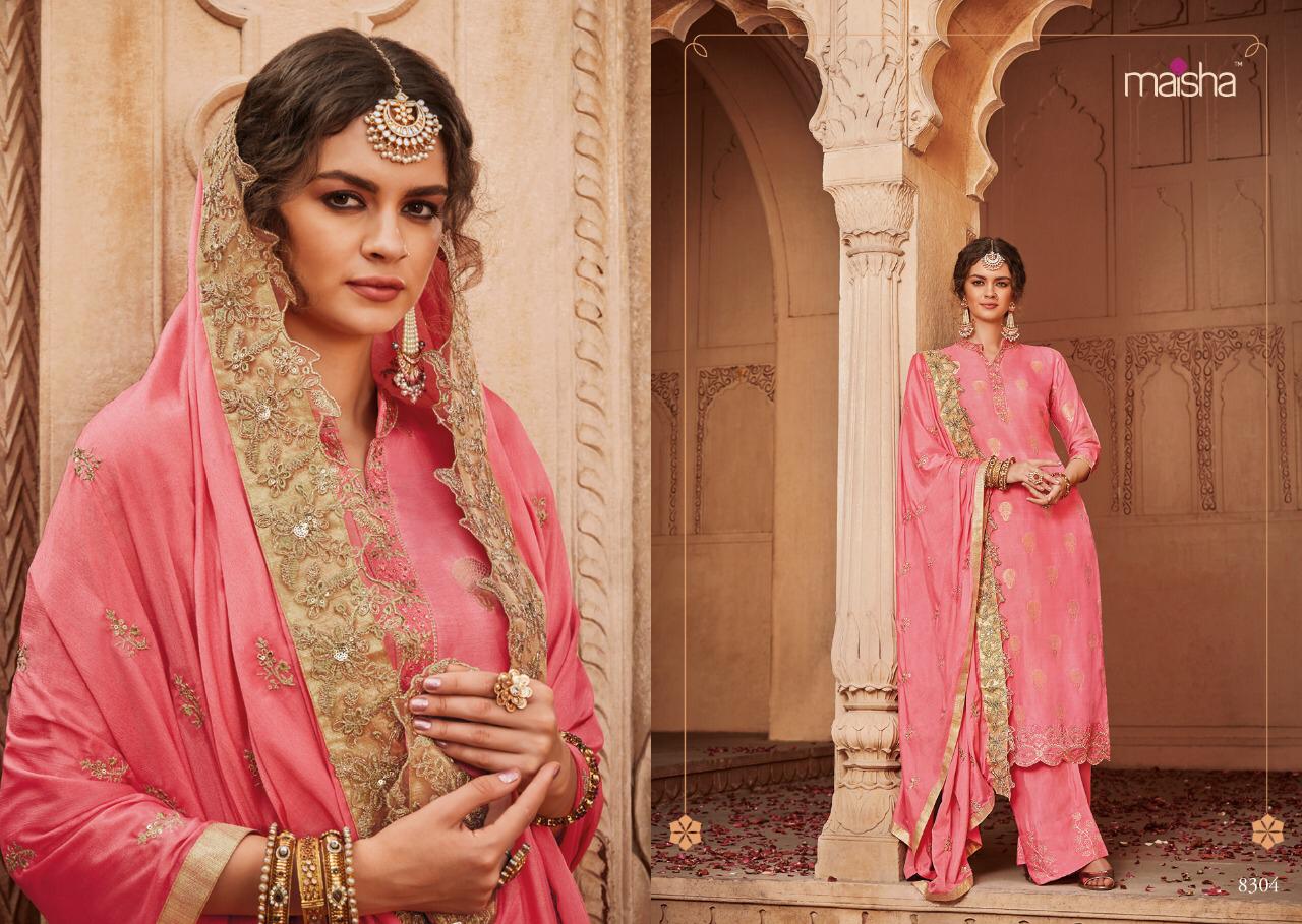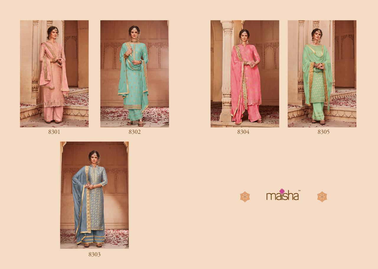 Buy Online Maisha Santhiya Series 8301 To 8305 Designer Party Wear Suits Set And Single Wholesale Supplier And Trader India 5 Pcs of Full Catalogue at Wholesale Price. Looking for Maisha Santhiya Series 8301 To 8305 Designer Party Wear Suits Set And Single Wholesale Supplier And Trader India Full Catalouge at Best Price? Buy Now Maisha Santhiya Series 8301 To 8305 Designer Party Wear Suits Set And Single Wholesale Supplier And Trader India at Wholesale Rate of Rs 11875 with Total 5 Pcs from authroized dealer and supplier of MAISHA Brand. Cost of Each piece is just only Rs 2375 which is very low and affordable price to resale the product in your retail store ,This is Surat based Wholesale Supplier & Dealer of MAISHA Brand. Click on Brand name to Know more about MAISHA Brand's products.Call or Whatsapp on 9898838984 for booking or enquiry
