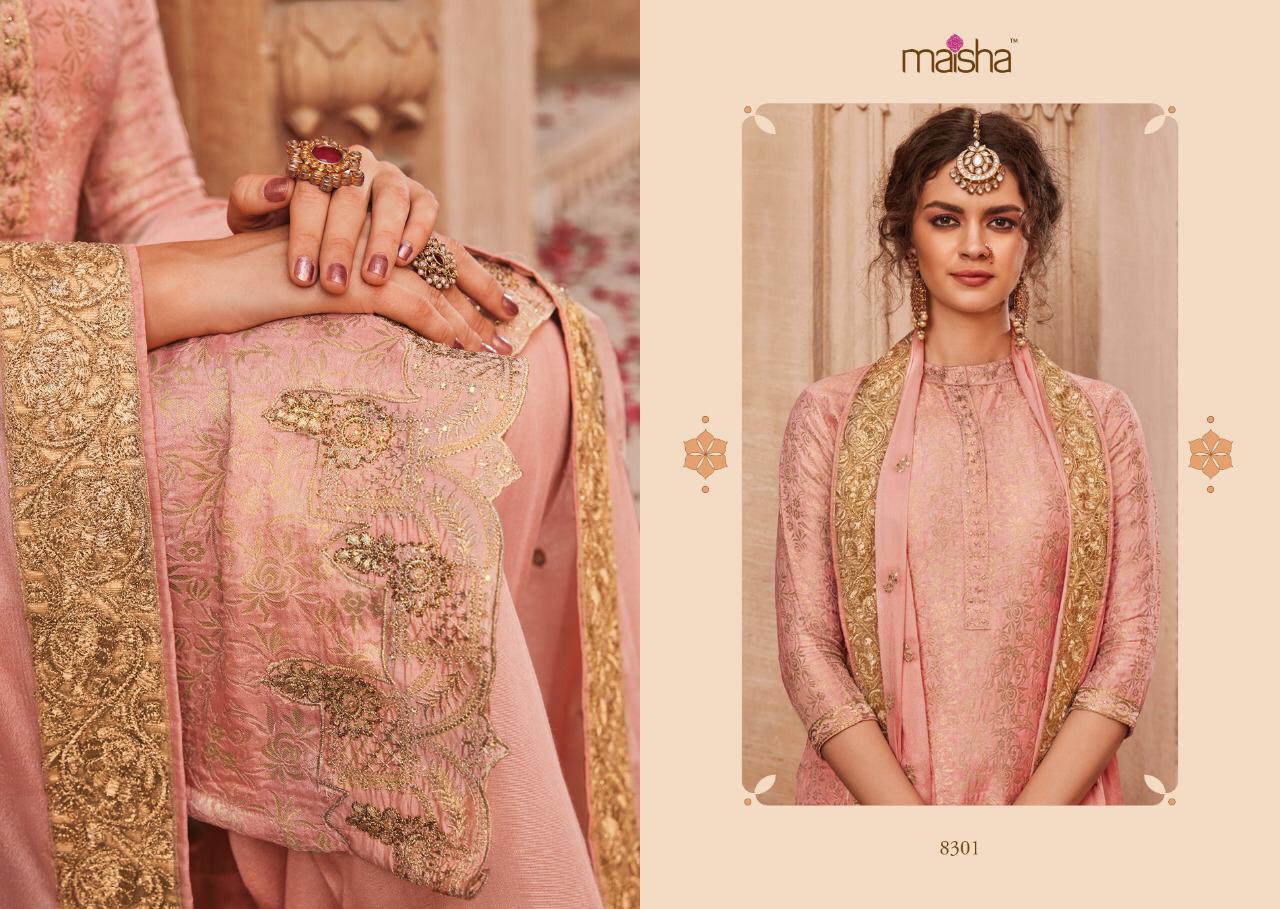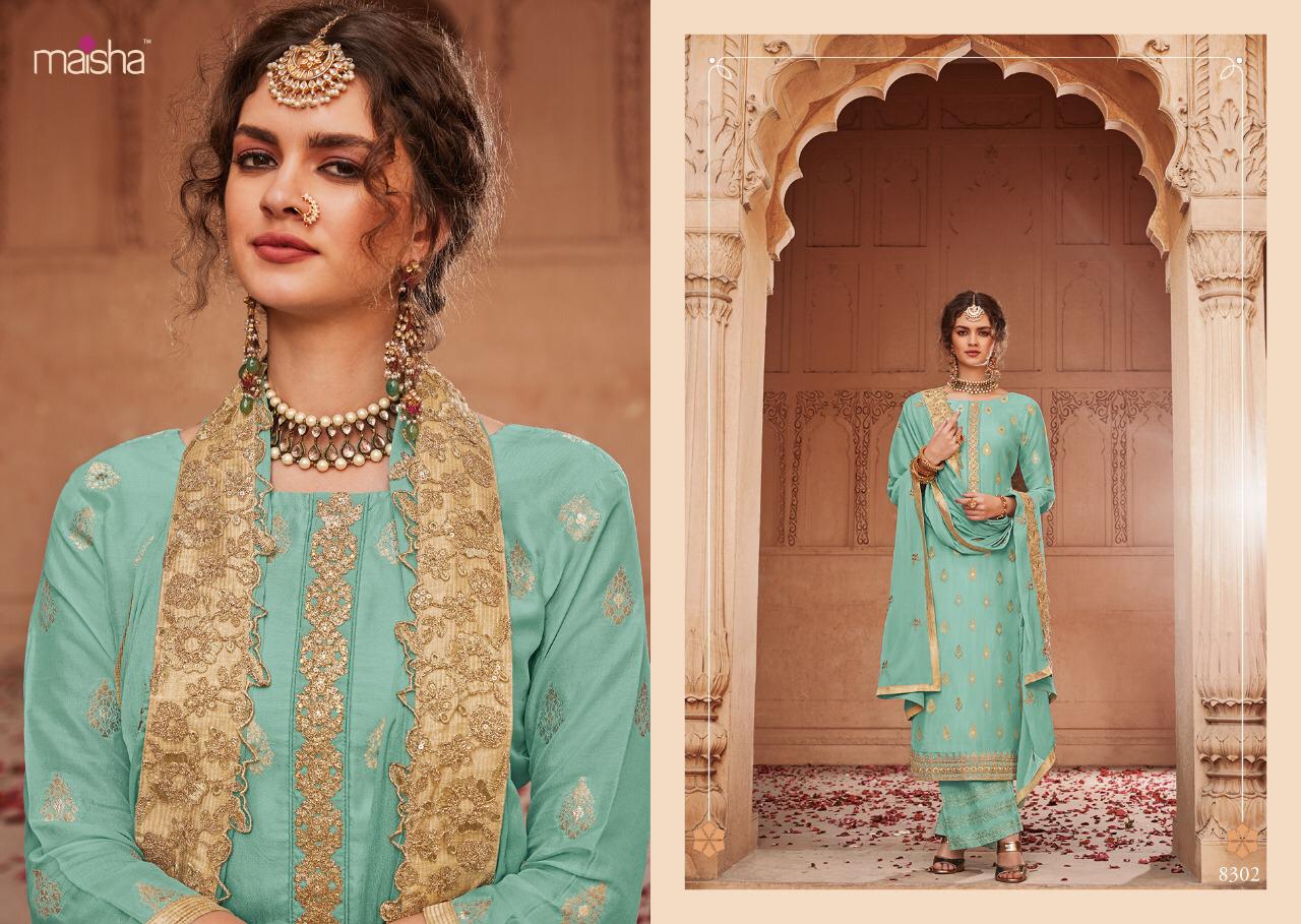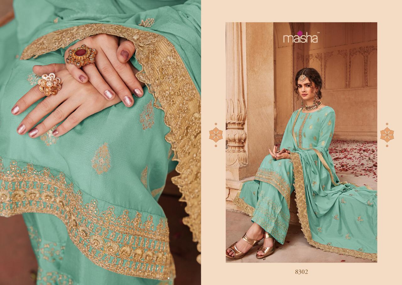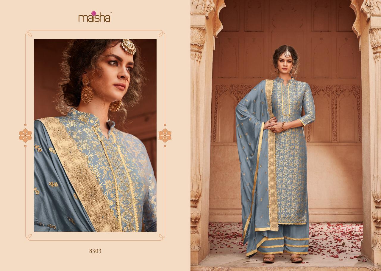 Buy Online Maisha Santhiya Series 8301 To 8305 Designer Party Wear Suits Set And Single Wholesale Supplier And Trader India 5 Pcs of Full Catalogue at Wholesale Price. Looking for Maisha Santhiya Series 8301 To 8305 Designer Party Wear Suits Set And Single Wholesale Supplier And Trader India Full Catalouge at Best Price? Buy Now Maisha Santhiya Series 8301 To 8305 Designer Party Wear Suits Set And Single Wholesale Supplier And Trader India at Wholesale Rate of Rs 11875 with Total 5 Pcs from authroized dealer and supplier of MAISHA Brand. Cost of Each piece is just only Rs 2375 which is very low and affordable price to resale the product in your retail store ,This is Surat based Wholesale Supplier & Dealer of MAISHA Brand. Click on Brand name to Know more about MAISHA Brand's products.Call or Whatsapp on 9898838984 for booking or enquiry