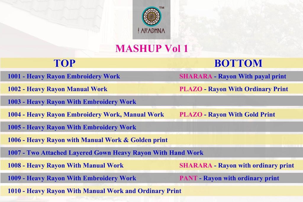 Buy Online Mashup Vol 1 By Aradhana Reyon Kurtis Wholesale Supplier And Dealer India 10 Pcs of Full Catalogue at Wholesale Price. Looking for Mashup Vol 1 By Aradhana Reyon Kurtis Wholesale Supplier And Dealer India Full Catalouge at Best Price? Buy Now Mashup Vol 1 By Aradhana Reyon Kurtis Wholesale Supplier And Dealer India at Wholesale Rate of Rs 6500 with Total 10 Pcs from authroized dealer and supplier of BRAND'S Brand. Cost of Each piece is just only Rs 650 which is very low and affordable price to resale the product in your retail store ,This is Surat based Wholesale Supplier & Dealer of BRAND'S Brand. Click on Brand name to Know more about BRAND'S Brand's products.Call or Whatsapp on 9898838984 for booking or enquiry