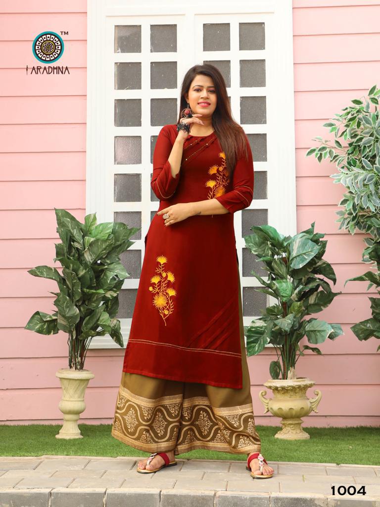 ? *ARADHNA* ? Catalog - *MASHUP VOL 1* (KURTI, SHARARA, PLAZO, PANT, GOWN) Brand : ARADHNA Fabric : *Kurti* - Heavy Rayon with Embroidery Work *Sharara* - Heavy Rayon With Ordinary Work *Plazo* - Heavy Rayon With Ordinary Print *Pant* - Heavy Rayon With Ordinary Print *Gown* - Heavy Rayon With Embroidery Work and Ordinary Print ?Size : M(38), L(40), XL(42), XXL(44), 3XL(46) ?Designs : 10 ?Rate : *650 Rs* + 5% GST Dispatch Date - 28/01/2020 |