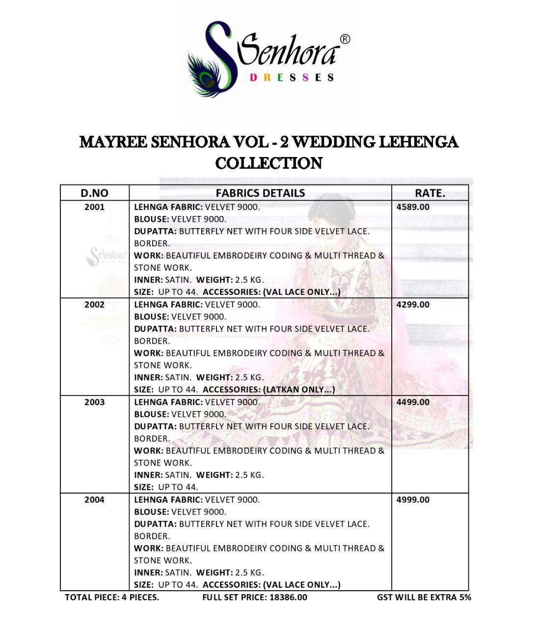 Buy Online Mayree Senhora Vol 2 Wedding Lehnga Collection Series 2001 To 2004 Designer Occasion Wear Lehangas Set And Single Wholesale Supplier Gujarat 4 Pcs of Full Catalogue at Wholesale Price. Looking for Mayree Senhora Vol 2 Wedding Lehnga Collection Series 2001 To 2004 Designer Occasion Wear Lehangas Set And Single Wholesale Supplier Gujarat Full Catalouge at Best Price? Buy Now Mayree Senhora Vol 2 Wedding Lehnga Collection Series 2001 To 2004 Designer Occasion Wear Lehangas Set And Single Wholesale Supplier Gujarat at Wholesale Rate of Rs 0 with Total 4 Pcs from authroized dealer and supplier of Brand. Cost of Each piece is just only Rs 0 which is very low and affordable price to resale the product in your retail store ,This is Surat based Wholesale Supplier & Dealer of Brand. Click on Brand name to Know more about Brand's products.Call or Whatsapp on 9898838984 for booking or enquiry