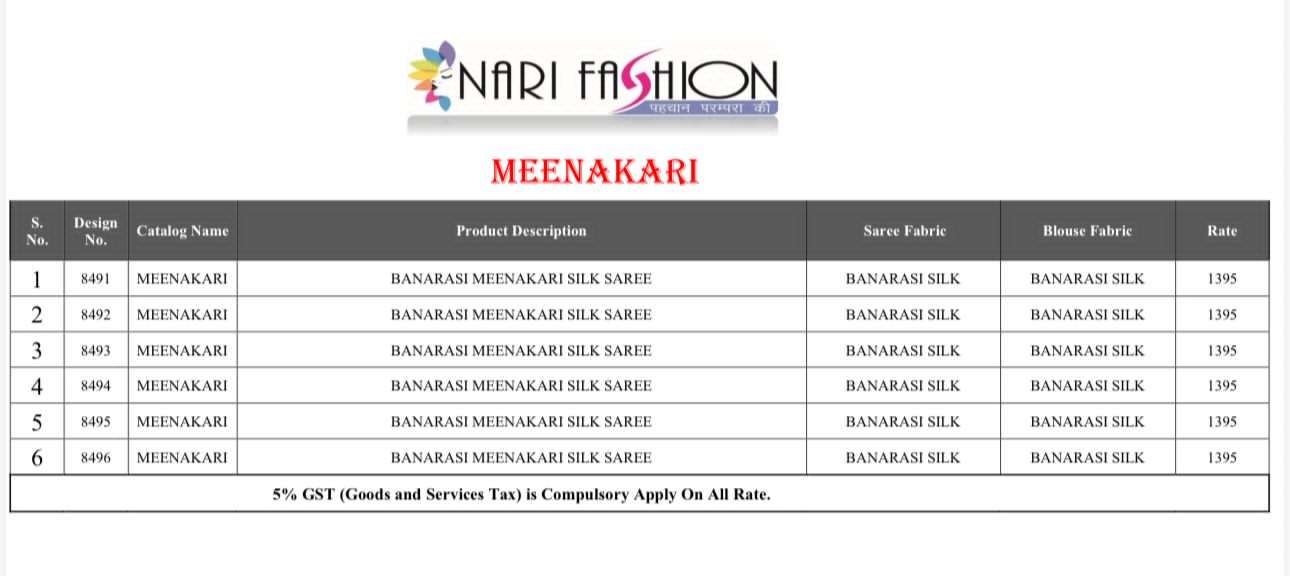 Buy Online MEENAKARI by nari fashion Saree collection manufacturer Surat 6 Pcs of Full Catalogue at Wholesale Price. Looking for MEENAKARI by nari fashion Saree collection manufacturer Surat Full Catalouge at Best Price? Buy Now MEENAKARI by nari fashion Saree collection manufacturer Surat at Wholesale Rate of Rs 8370 with Total 6 Pcs from authroized dealer and supplier of Nari Fashion Brand. Cost of Each piece is just only Rs 1395 which is very low and affordable price to resale the product in your retail store ,This is Surat based Wholesale Supplier & Dealer of Nari Fashion Brand. Click on Brand name to Know more about Nari Fashion Brand's products.Call or Whatsapp on 9898838984 for booking or enquiry