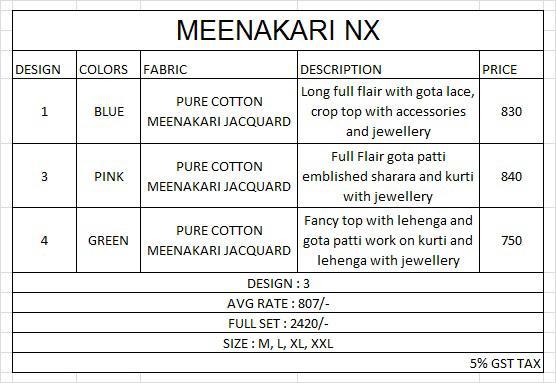 Buy Online Meenakari Nx By Mustard Nx Pure Cotton Meenakari Jaquard Top With Skirts Wholesale Supplier And Dealer Surat 3 Pcs of Full Catalogue at Wholesale Price. Looking for Meenakari Nx By Mustard Nx Pure Cotton Meenakari Jaquard Top With Skirts Wholesale Supplier And Dealer Surat Full Catalouge at Best Price? Buy Now Meenakari Nx By Mustard Nx Pure Cotton Meenakari Jaquard Top With Skirts Wholesale Supplier And Dealer Surat at Wholesale Rate of Rs 2421 with Total 3 Pcs from authroized dealer and supplier of Brand. Cost of Each piece is just only Rs 807 which is very low and affordable price to resale the product in your retail store ,This is Surat based Wholesale Supplier & Dealer of Brand. Click on Brand name to Know more about Brand's products.Call or Whatsapp on 9898838984 for booking or enquiry