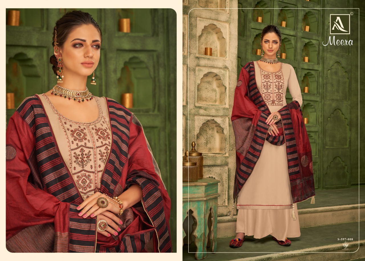 Buy Online Meera By Alok Suit Dealer From India 8 Pcs of Full Catalogue at Wholesale Price. Looking for Meera By Alok Suit Dealer From India Full Catalouge at Best Price? Buy Now Meera By Alok Suit Dealer From India at Wholesale Rate of Rs 7288 with Total 8 Pcs from authroized dealer and supplier of Brand. Cost of Each piece is just only Rs 911 which is very low and affordable price to resale the product in your retail store ,This is Surat based Wholesale Supplier & Dealer of Brand. Click on Brand name to Know more about Brand's products.Call or Whatsapp on 9898838984 for booking or enquiry
