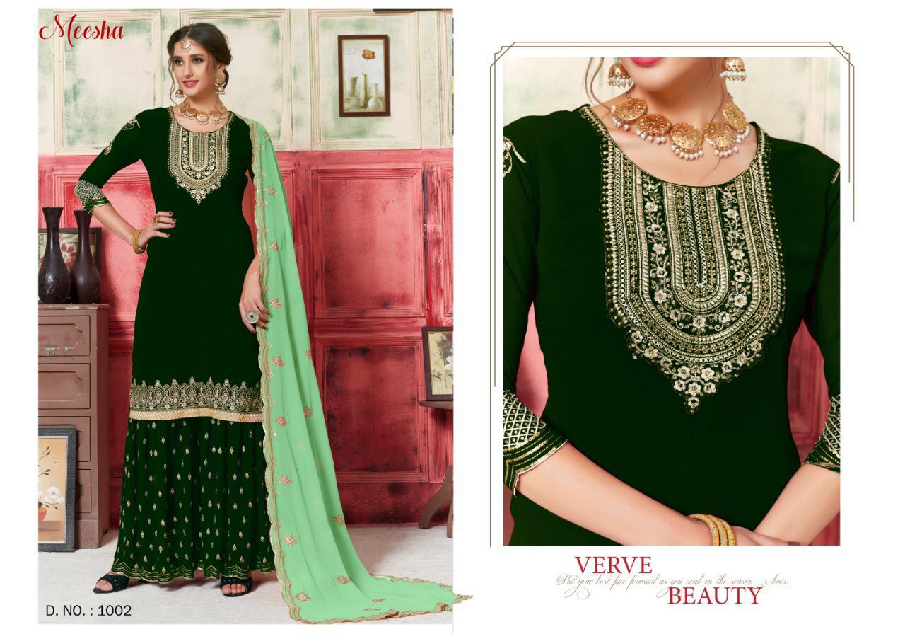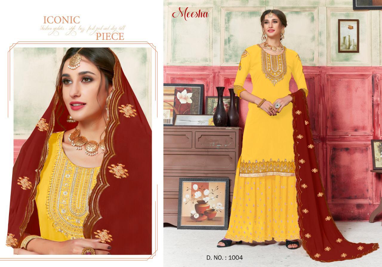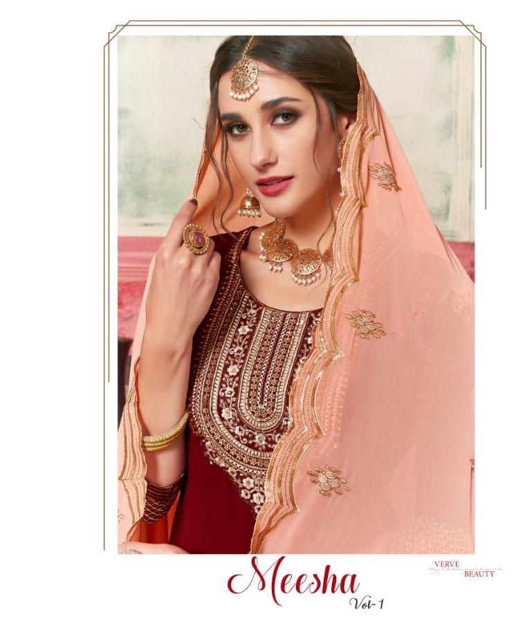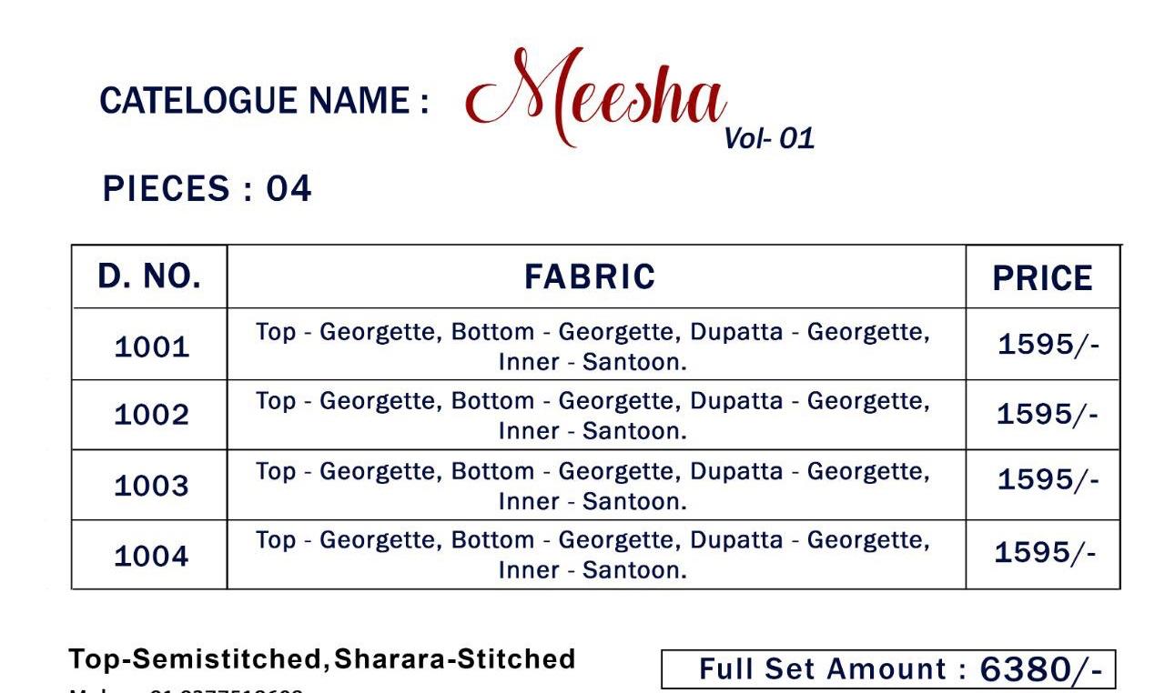 Buy Online Meesha Vol 1designer Suit Set And Single Wholesale Supplier Gujarat 4 Pcs of Full Catalogue at Wholesale Price. Looking for Meesha Vol 1designer Suit Set And Single Wholesale Supplier Gujarat Full Catalouge at Best Price? Buy Now Meesha Vol 1designer Suit Set And Single Wholesale Supplier Gujarat at Wholesale Rate of Rs 6380 with Total 4 Pcs from authroized dealer and supplier of Brand. Cost of Each piece is just only Rs 1595 which is very low and affordable price to resale the product in your retail store ,This is Surat based Wholesale Supplier & Dealer of Brand. Click on Brand name to Know more about Brand's products.Call or Whatsapp on 9898838984 for booking or enquiry