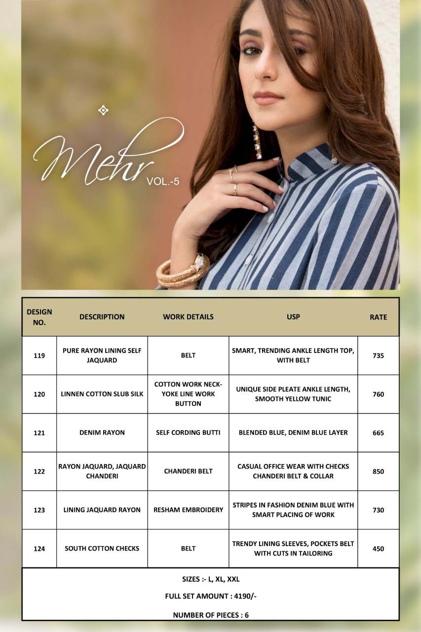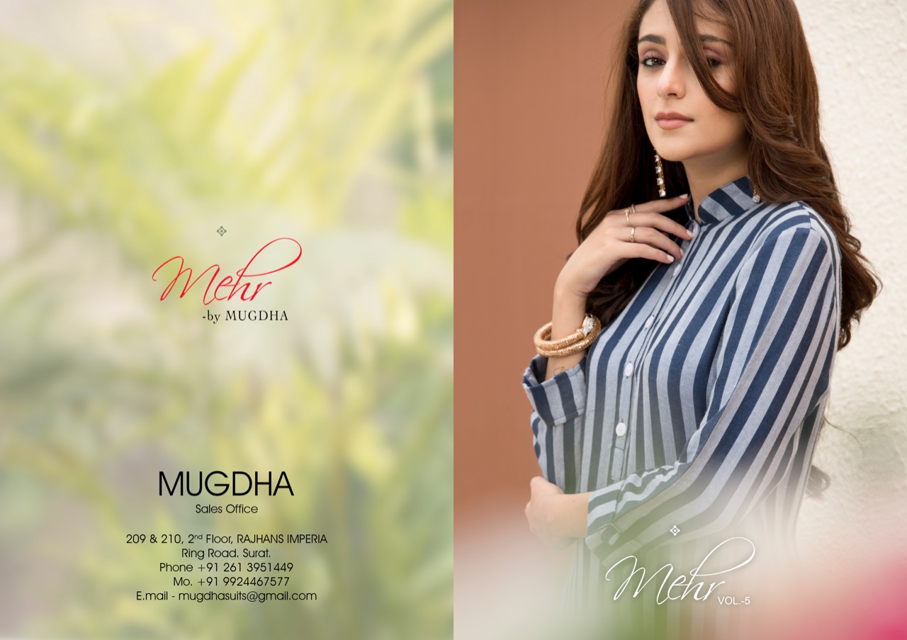 Buy Online Mehr Vol 5 By Mugdha Cotton Kurtis Wholesale Supplier And Dealer Gujarat 6 Pcs of Full Catalogue at Wholesale Price. Looking for Mehr Vol 5 By Mugdha Cotton Kurtis Wholesale Supplier And Dealer Gujarat Full Catalouge at Best Price? Buy Now Mehr Vol 5 By Mugdha Cotton Kurtis Wholesale Supplier And Dealer Gujarat at Wholesale Rate of Rs 4194 with Total 6 Pcs from authroized dealer and supplier of MUGDHA Brand. Cost of Each piece is just only Rs 699 which is very low and affordable price to resale the product in your retail store ,This is Surat based Wholesale Supplier & Dealer of MUGDHA Brand. Click on Brand name to Know more about MUGDHA Brand's products.Call or Whatsapp on 9898838984 for booking or enquiry