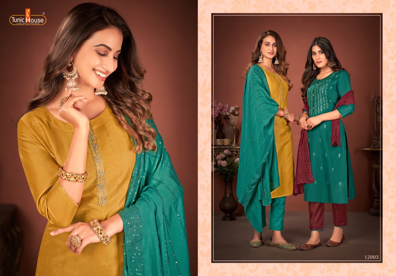 *TUNIC HOUSE* *_PRESENTS EXCLUSIVE FANCY COLLECTION_* *? MERAKI?* *(TOP+BOTTOM+DUPATTA)* *TOP :- SILK With SEQUENCE EMBROIDERY &HAND WORK* *BOTTOM :- SILK* *DUPATTA :- FANCY WEAVING SEQUENCE DUPATTA* *SIZE. :- M. L. XL. 2XL. 3XL* *RATE : 1050/-* Gst Tax Extra *_Set Of 4 Design_* Set to set *DISPATCH :- Today * |