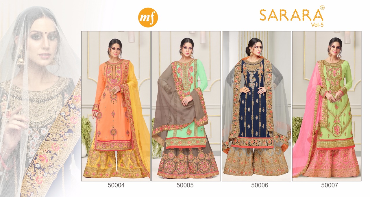 Buy Online Mf Sarara Vol 5 Series 50004 To 50007 Wholesale Dealer 4 Pcs of Full Catalogue at Wholesale Price. Looking for Mf Sarara Vol 5 Series 50004 To 50007 Wholesale Dealer Full Catalouge at Best Price? Buy Now Mf Sarara Vol 5 Series 50004 To 50007 Wholesale Dealer at Wholesale Rate of Rs 7580 with Total 4 Pcs from authroized dealer and supplier of MAHAVEER FASHION Brand. Cost of Each piece is just only Rs 1895 which is very low and affordable price to resale the product in your retail store ,This is Surat based Wholesale Supplier & Dealer of MAHAVEER FASHION Brand. Click on Brand name to Know more about MAHAVEER FASHION Brand's products.Call or Whatsapp on 9898838984 for booking or enquiry