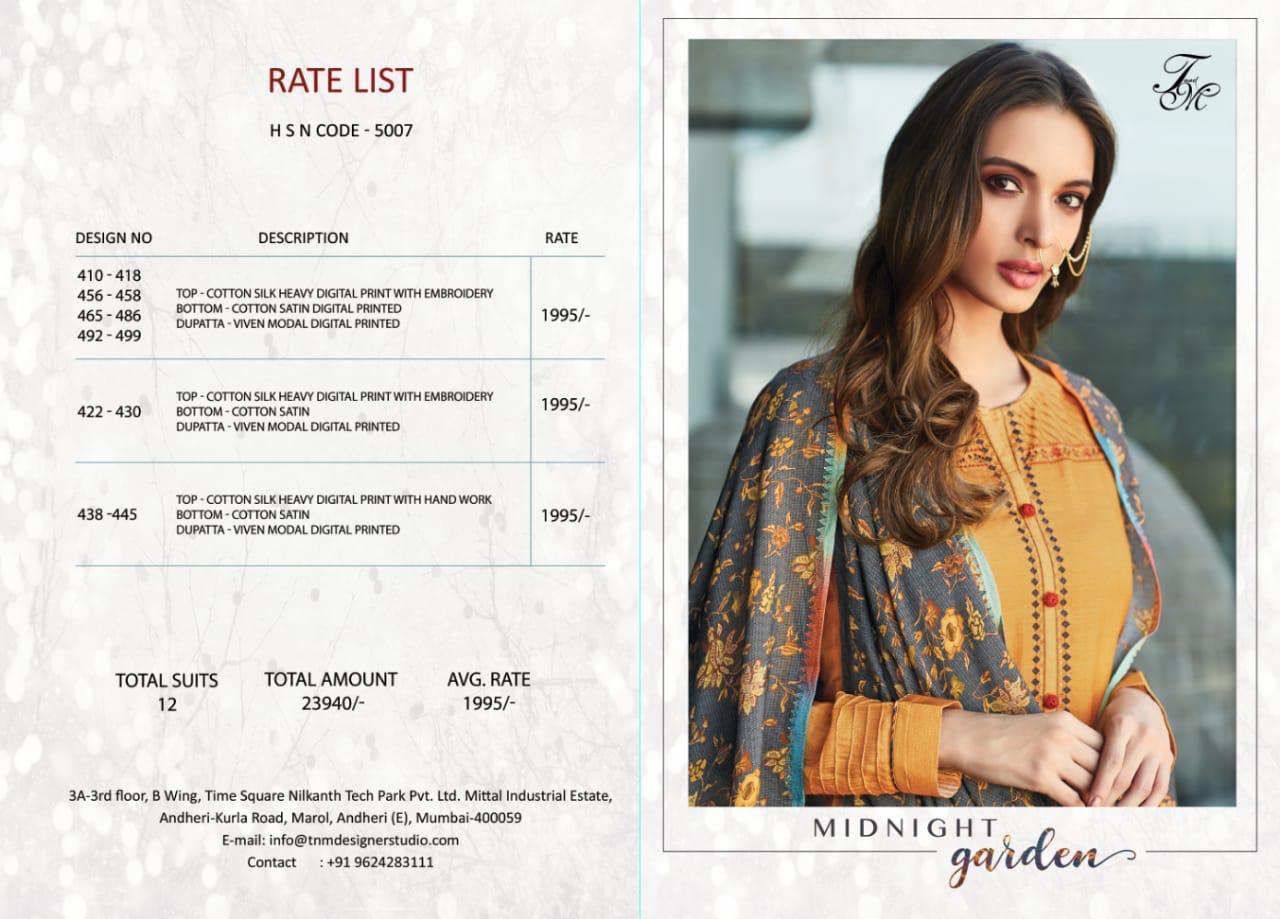Buy Online Midnight Garden By T N M Sahiba Fancy Cotton Silk Heavy Digital Printed Salwar Kameez Catlog Wholesale Dealer Surat 12 Pcs of Full Catalogue at Wholesale Price. Looking for Midnight Garden By T N M Sahiba Fancy Cotton Silk Heavy Digital Printed Salwar Kameez Catlog Wholesale Dealer Surat Full Catalouge at Best Price? Buy Now Midnight Garden By T N M Sahiba Fancy Cotton Silk Heavy Digital Printed Salwar Kameez Catlog Wholesale Dealer Surat at Wholesale Rate of Rs 23940 with Total 12 Pcs from authroized dealer and supplier of SAHIBA Brand. Cost of Each piece is just only Rs 1995 which is very low and affordable price to resale the product in your retail store ,This is Surat based Wholesale Supplier & Dealer of SAHIBA Brand. Click on Brand name to Know more about SAHIBA Brand's products.Call or Whatsapp on 9898838984 for booking or enquiry