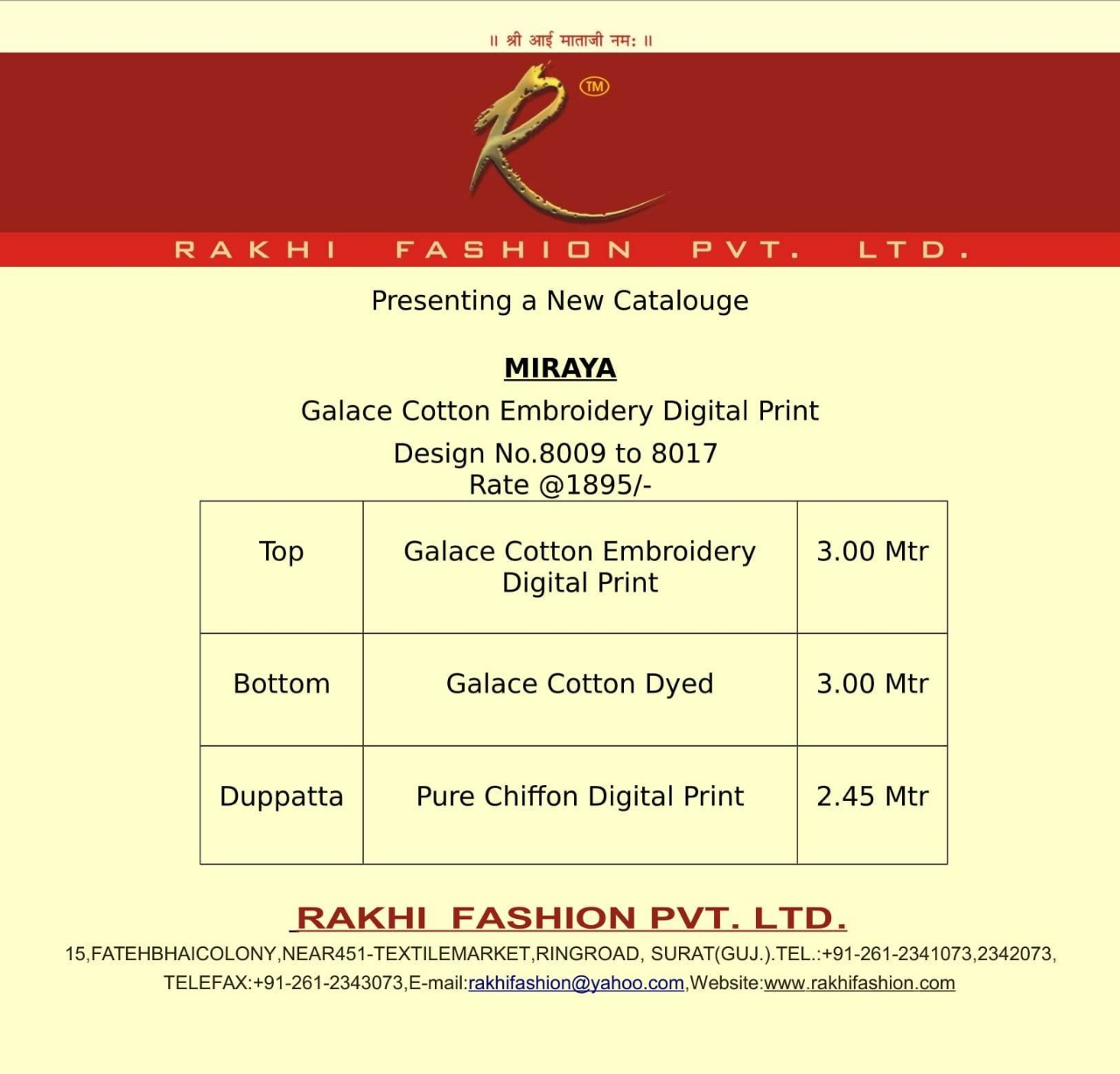 Buy Online Miraya By Rakhi Cotton Embroidered Designer Party Wear Dresses Wholesale Supplier And Dealer Gujarat 9 Pcs of Full Catalogue at Wholesale Price. Looking for Miraya By Rakhi Cotton Embroidered Designer Party Wear Dresses Wholesale Supplier And Dealer Gujarat Full Catalouge at Best Price? Buy Now Miraya By Rakhi Cotton Embroidered Designer Party Wear Dresses Wholesale Supplier And Dealer Gujarat at Wholesale Rate of Rs 17055 with Total 9 Pcs from authroized dealer and supplier of Brand. Cost of Each piece is just only Rs 1895 which is very low and affordable price to resale the product in your retail store ,This is Surat based Wholesale Supplier & Dealer of Brand. Click on Brand name to Know more about Brand's products.Call or Whatsapp on 9898838984 for booking or enquiry