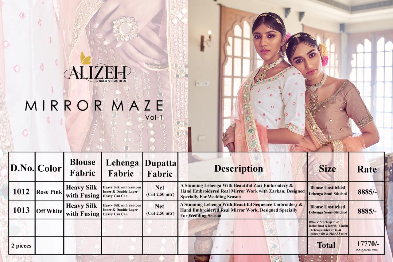 Buy Online Mirror Maze Vol 1 By Alizeh 1012 And 1013 Singles Pieces Available Stockiest Dealer Supplier Manufacturer Surat 2 Pcs of Full Catalogue at Wholesale Price. Looking for Mirror Maze Vol 1 By Alizeh 1012 And 1013 Singles Pieces Available Stockiest Dealer Supplier Manufacturer Surat Full Catalouge at Best Price? Buy Now Mirror Maze Vol 1 By Alizeh 1012 And 1013 Singles Pieces Available Stockiest Dealer Supplier Manufacturer Surat at Wholesale Rate of Rs 17770 with Total 2 Pcs from authroized dealer and supplier of BRAND'S Brand. Cost of Each piece is just only Rs 8885 which is very low and affordable price to resale the product in your retail store ,This is Surat based Wholesale Supplier & Dealer of BRAND'S Brand. Click on Brand name to Know more about BRAND'S Brand's products.Call or Whatsapp on 9898838984 for booking or enquiry
