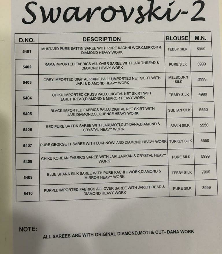 Buy Online Mn Swarovski Vol 2 Series 5401 To 5410 Designer Party Wear Sarees Wholesale Supplier Gujarat 10 Pcs of Full Catalogue at Wholesale Price. Looking for Mn Swarovski Vol 2 Series 5401 To 5410 Designer Party Wear Sarees Wholesale Supplier Gujarat Full Catalouge at Best Price? Buy Now Mn Swarovski Vol 2 Series 5401 To 5410 Designer Party Wear Sarees Wholesale Supplier Gujarat at Wholesale Rate of Rs 0 with Total 10 Pcs from authroized dealer and supplier of BRAND'S Brand. Cost of Each piece is just only Rs 0 which is very low and affordable price to resale the product in your retail store ,This is Surat based Wholesale Supplier & Dealer of BRAND'S Brand. Click on Brand name to Know more about BRAND'S Brand's products.Call or Whatsapp on 9898838984 for booking or enquiry
