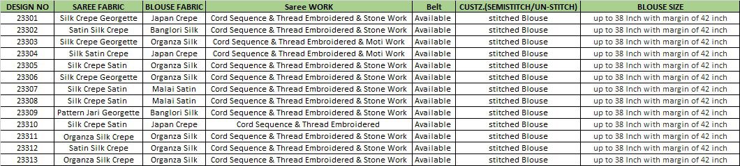 *BRAND NAME : MAHOTSAV* *CATALOG : "MOH-MANTHAN-23300 SERIES-ENIGMA* *PRICE :-* *23301-3675/-* *23302-3425/-* *23303-3515/-* *23304-3465/-* *23305-3675/-* *23306-3775/-* *23307-3655/-* *23308-3155/-* *23309-3415/-* *23310-3415/-* *23311-3465/-* *23312-2895/-* *23313-3745/-* *5% GST EXTRA* *SAREE FABRIC -: ATTACHED* *BLOUSE FABRIC:- ATTACHED* *BLOUSE TYPE : STITCHED* *BLOUSE SIZE : up to 38 Inch with margin of 42 inch* *SINGLES & SET WISE AVAILABLE * 100+single |