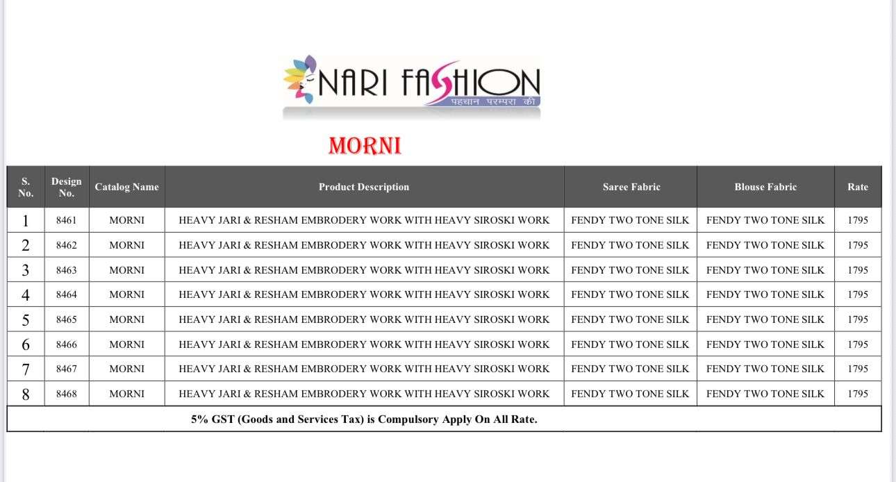 Buy Online MORNI BY NARI FASHION saree collection manufacturer Surat 8 Pcs of Full Catalogue at Wholesale Price. Looking for MORNI BY NARI FASHION saree collection manufacturer Surat Full Catalouge at Best Price? Buy Now MORNI BY NARI FASHION saree collection manufacturer Surat at Wholesale Rate of Rs 14360 with Total 8 Pcs from authroized dealer and supplier of Nari Fashion Brand. Cost of Each piece is just only Rs 1795 which is very low and affordable price to resale the product in your retail store ,This is Surat based Wholesale Supplier & Dealer of Nari Fashion Brand. Click on Brand name to Know more about Nari Fashion Brand's products.Call or Whatsapp on 9898838984 for booking or enquiry