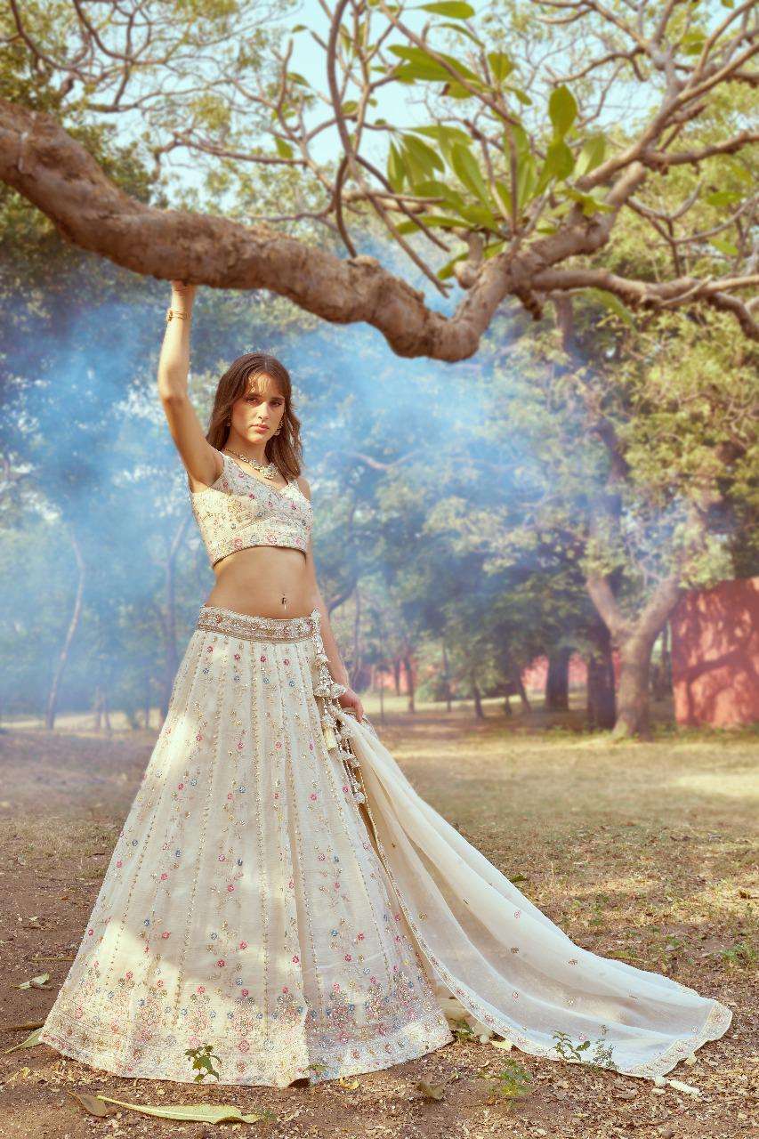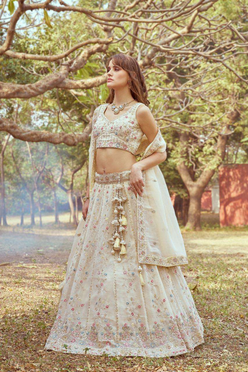 Moti hand work by cream gold crushed tissue fabric lehenga choli dupatta manufacturer surat