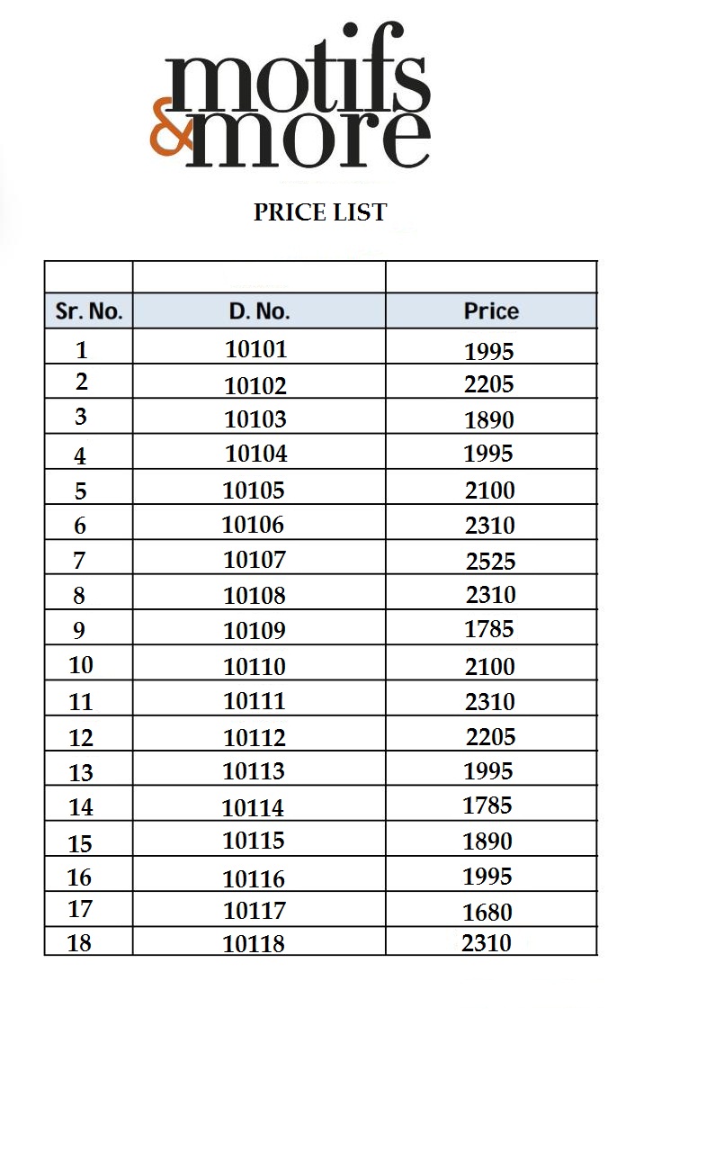 Brand - Motifs & More . Series -10101 to 10118. Set & Loose . GST 5 Percent Extra . Delivery from -05-09-18. Book your order now . |