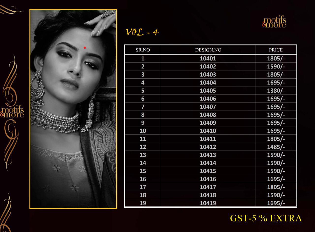 Buy Online Motifs And More Vol 4 Series 10401 To 101419 Designer Party Wear Sarees Wholesale Supplier And Trader Gujarat 19 Pcs of Full Catalogue at Wholesale Price. Looking for Motifs And More Vol 4 Series 10401 To 101419 Designer Party Wear Sarees Wholesale Supplier And Trader Gujarat Full Catalouge at Best Price? Buy Now Motifs And More Vol 4 Series 10401 To 101419 Designer Party Wear Sarees Wholesale Supplier And Trader Gujarat at Wholesale Rate of Rs 31597 with Total 19 Pcs from authroized dealer and supplier of BRAND'S Brand. Cost of Each piece is just only Rs 1663 which is very low and affordable price to resale the product in your retail store ,This is Surat based Wholesale Supplier & Dealer of BRAND'S Brand. Click on Brand name to Know more about BRAND'S Brand's products.Call or Whatsapp on 9898838984 for booking or enquiry