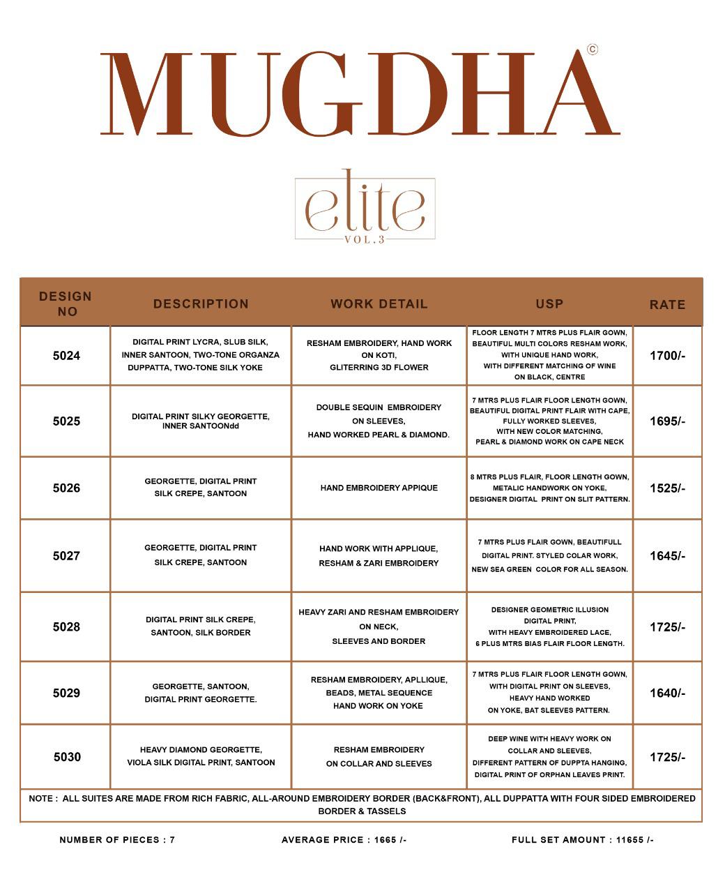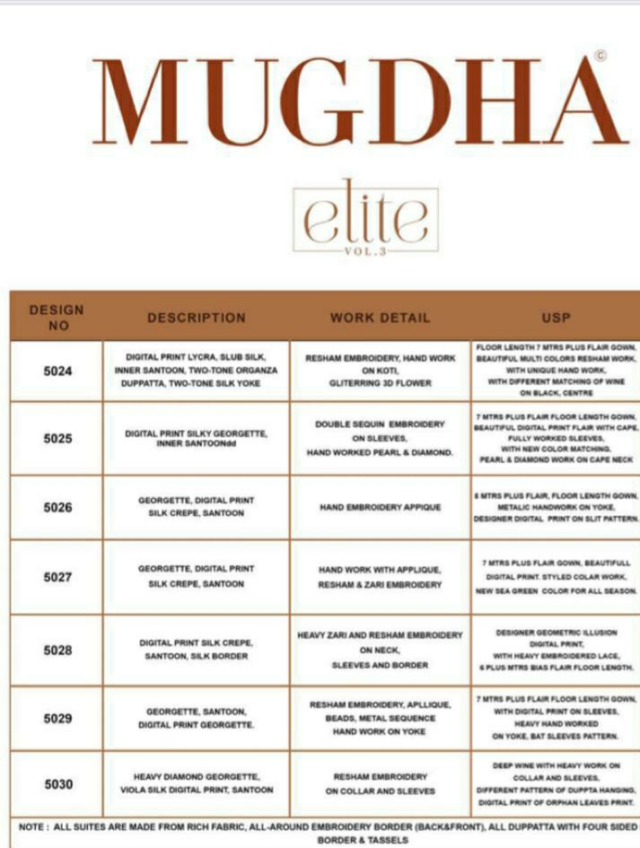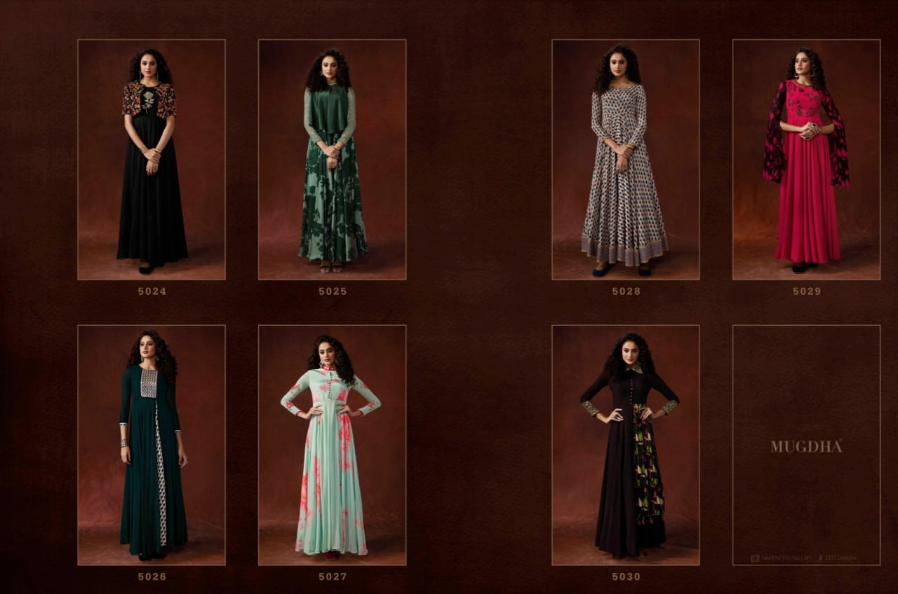 Buy Online Mugdha Elite Vol 3 Series 5024 To 5030 Designer Ready To Wear Gowns Set Nd Single Wholesale Supplier Gujarat 7 Pcs of Full Catalogue at Wholesale Price. Looking for Mugdha Elite Vol 3 Series 5024 To 5030 Designer Ready To Wear Gowns Set Nd Single Wholesale Supplier Gujarat Full Catalouge at Best Price? Buy Now Mugdha Elite Vol 3 Series 5024 To 5030 Designer Ready To Wear Gowns Set Nd Single Wholesale Supplier Gujarat at Wholesale Rate of Rs 11655 with Total 7 Pcs from authroized dealer and supplier of MUGDHA Brand. Cost of Each piece is just only Rs 1665 which is very low and affordable price to resale the product in your retail store ,This is Surat based Wholesale Supplier & Dealer of MUGDHA Brand. Click on Brand name to Know more about MUGDHA Brand's products.Call or Whatsapp on 9898838984 for booking or enquiry