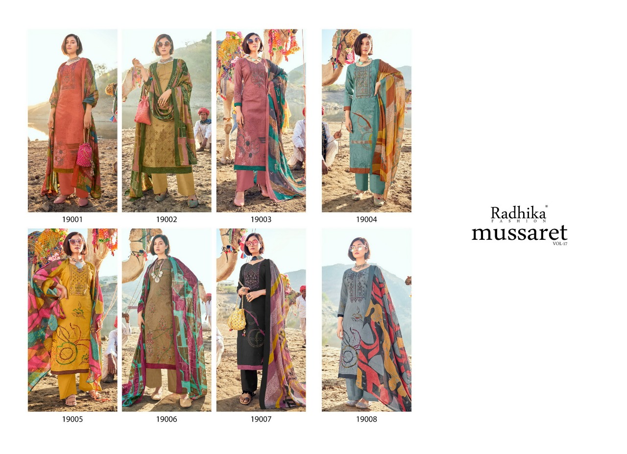 Buy Online Mussaret Vol 17 By Azara Wholesaler Supplier From Surat 8 Pcs of Full Catalogue at Wholesale Price. Looking for Mussaret Vol 17 By Azara Wholesaler Supplier From Surat Full Catalouge at Best Price? Buy Now Mussaret Vol 17 By Azara Wholesaler Supplier From Surat at Wholesale Rate of Rs 5440 with Total 8 Pcs from authroized dealer and supplier of RADHIKA Brand. Cost of Each piece is just only Rs 680 which is very low and affordable price to resale the product in your retail store ,This is Surat based Wholesale Supplier & Dealer of RADHIKA Brand. Click on Brand name to Know more about RADHIKA Brand's products.Call or Whatsapp on 9898838984 for booking or enquiry