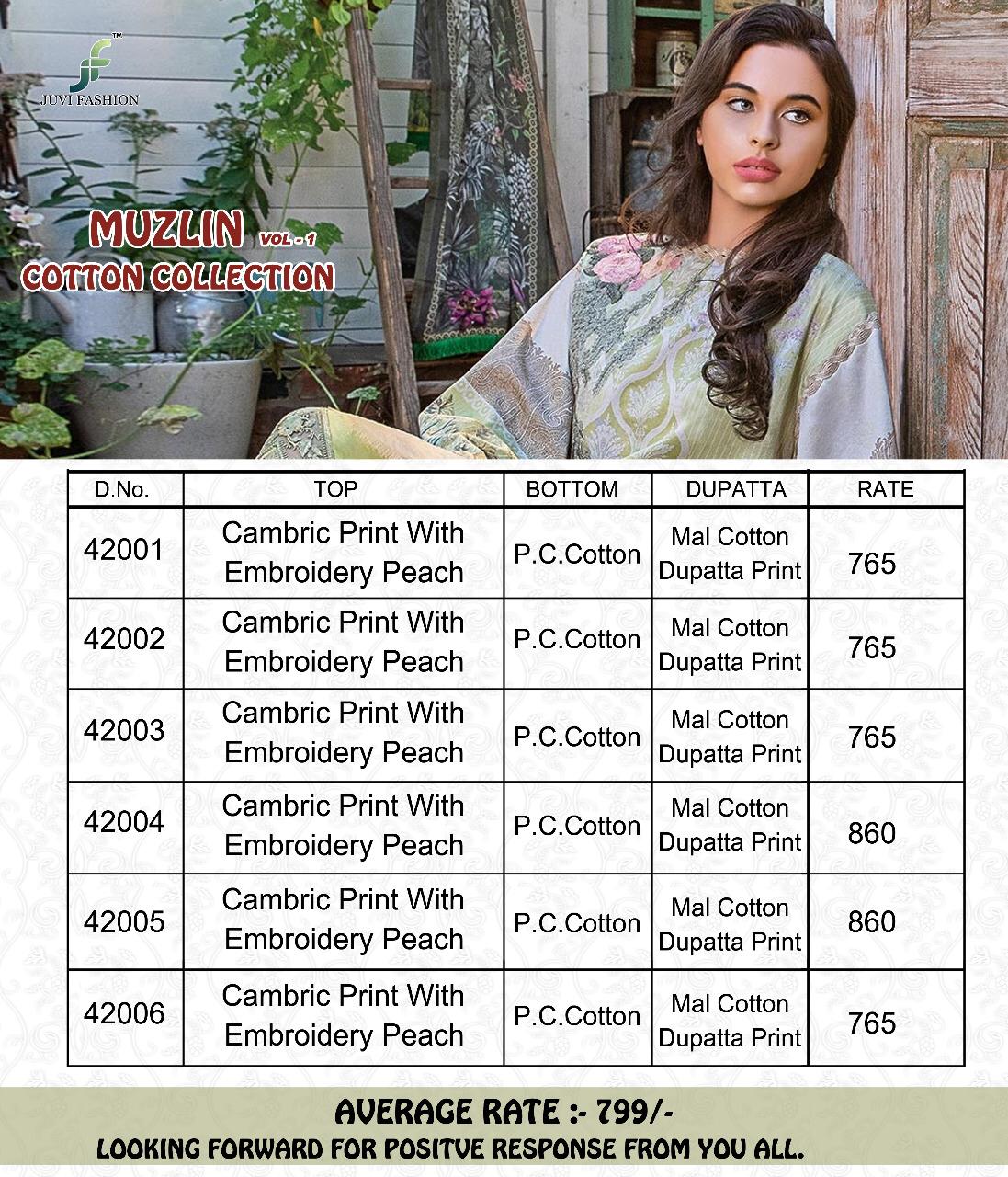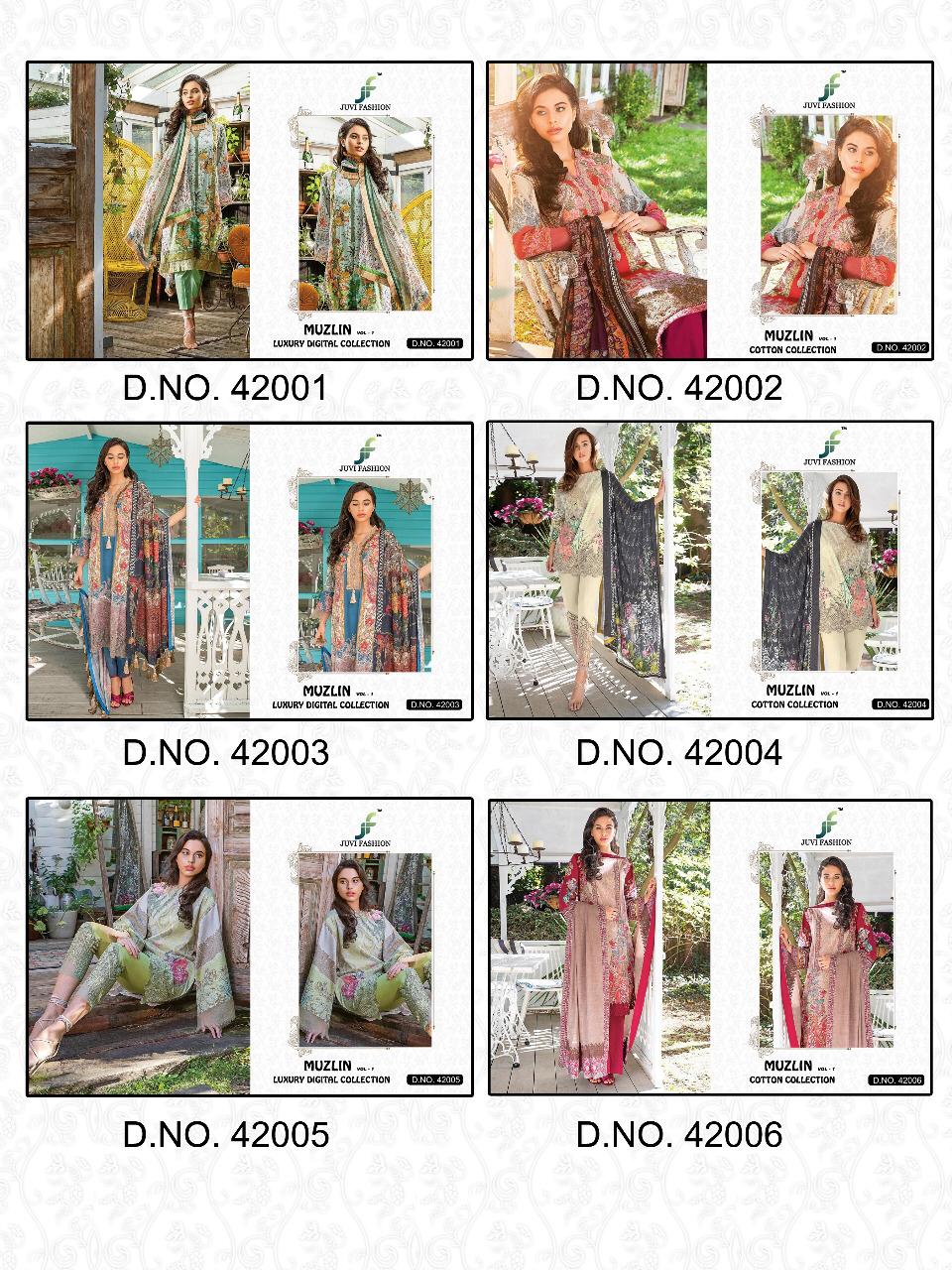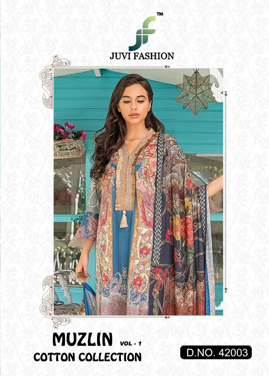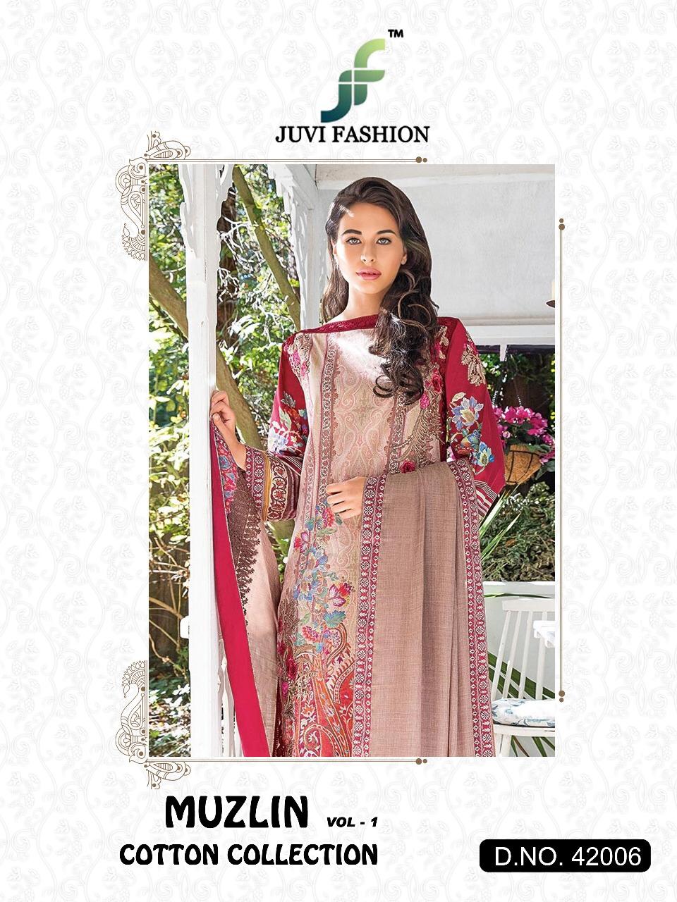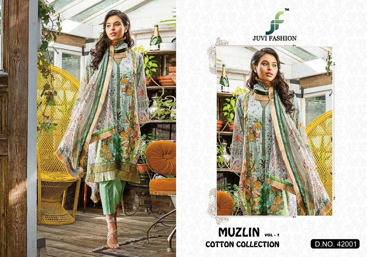 Buy Online Muzlin Vol 1 By Juvi Fashion 42001 To 42006 Pakistani Suits Wholesale Supplier Gujarat 6 Pcs of Full Catalogue at Wholesale Price. Looking for Muzlin Vol 1 By Juvi Fashion 42001 To 42006 Pakistani Suits Wholesale Supplier Gujarat Full Catalouge at Best Price? Buy Now Muzlin Vol 1 By Juvi Fashion 42001 To 42006 Pakistani Suits Wholesale Supplier Gujarat at Wholesale Rate of Rs 4794 with Total 6 Pcs from authroized dealer and supplier of Brand. Cost of Each piece is just only Rs 799 which is very low and affordable price to resale the product in your retail store ,This is Surat based Wholesale Supplier & Dealer of Brand. Click on Brand name to Know more about Brand's products.Call or Whatsapp on 9898838984 for booking or enquiry
