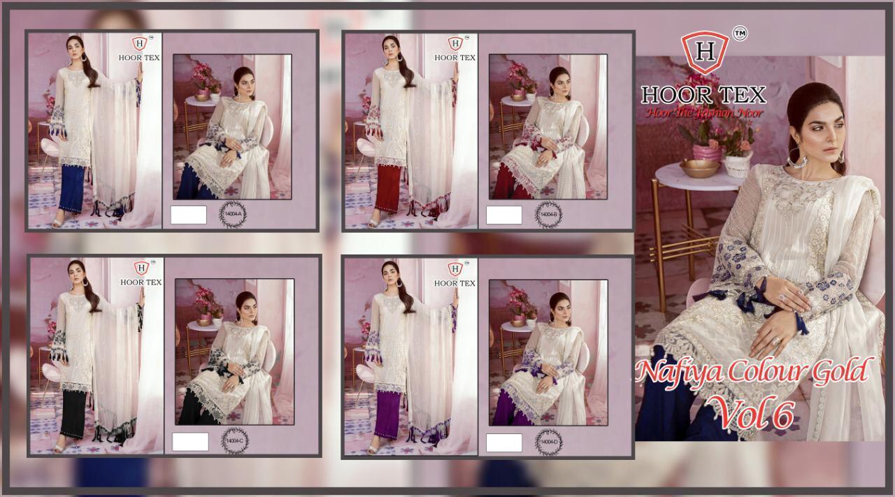 Buy Online Nafiya Color Gold Vol 6 By Hoor Tex Series 14004 Pakistani Suits Wholesale Set And Single Wholesale Supplier Surat 4 Pcs of Full Catalogue at Wholesale Price. Looking for Nafiya Color Gold Vol 6 By Hoor Tex Series 14004 Pakistani Suits Wholesale Set And Single Wholesale Supplier Surat Full Catalouge at Best Price? Buy Now Nafiya Color Gold Vol 6 By Hoor Tex Series 14004 Pakistani Suits Wholesale Set And Single Wholesale Supplier Surat at Wholesale Rate of Rs 4600 with Total 4 Pcs from authroized dealer and supplier of Brand. Cost of Each piece is just only Rs 1150 which is very low and affordable price to resale the product in your retail store ,This is Surat based Wholesale Supplier & Dealer of Brand. Click on Brand name to Know more about Brand's products.Call or Whatsapp on 9898838984 for booking or enquiry