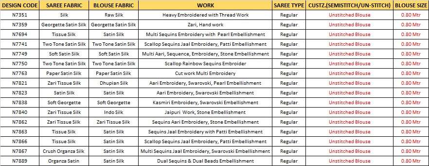 | Note | Stitching available on customer Requirment For Sarees , Salwar Kameez, Lehengha.(i.e M,L,XL,XXL). |