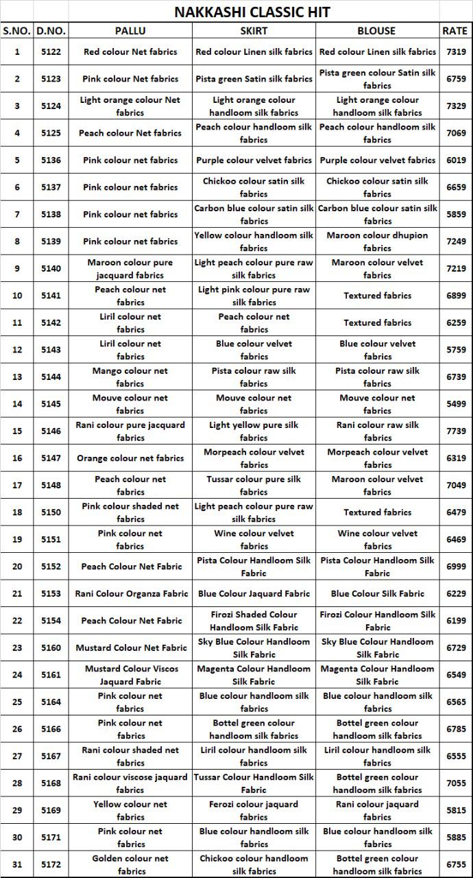 Nakkashi classic Hit . Lehnega . Singel PCs Availab. GST 12 Percent Extra. Single Extra 100 Delivery from today Loose pcs available |
