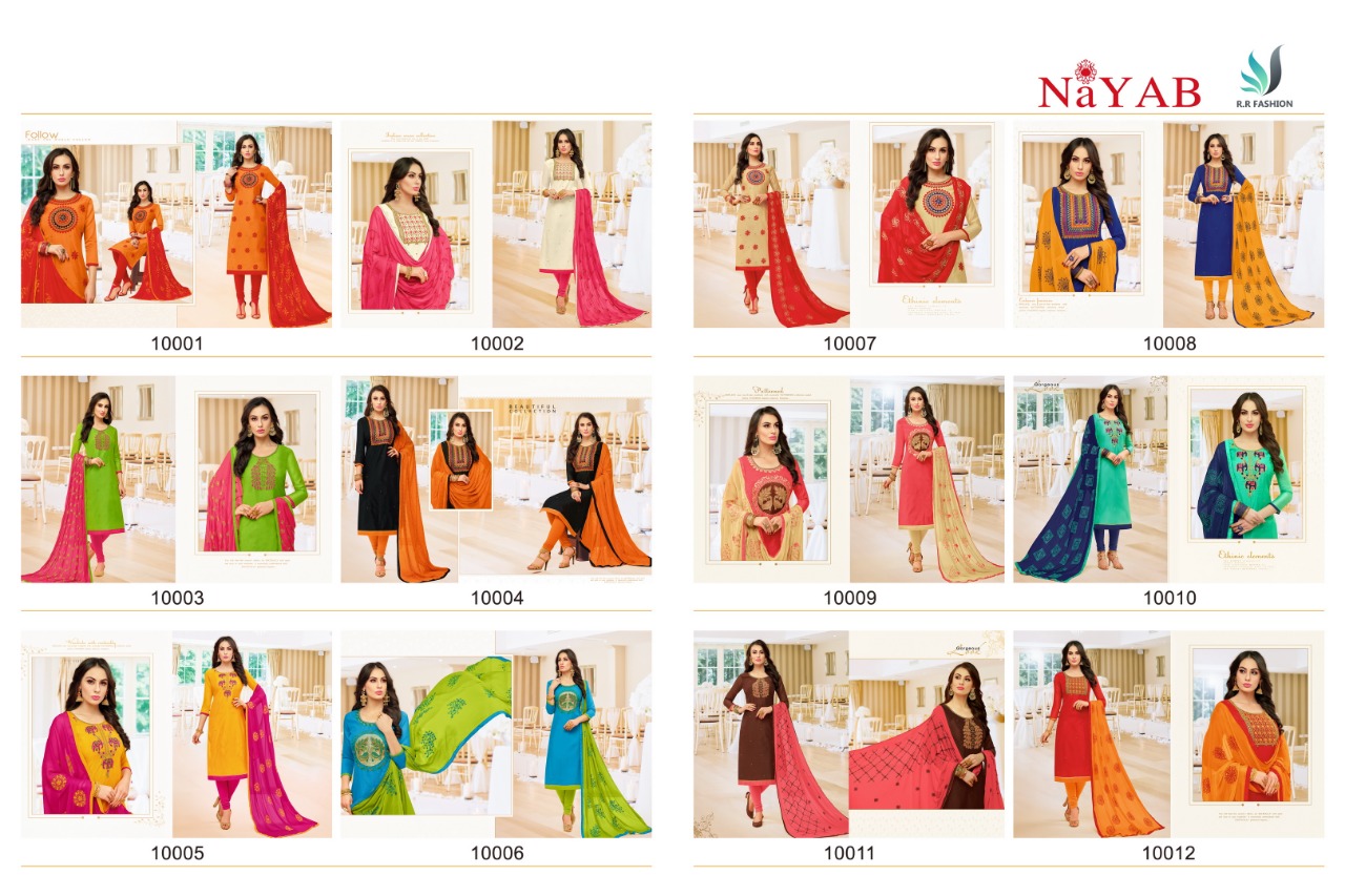 Buy Online Nayab By R R Fashion 10001 Series Fancy Modal Salwar Kameez Catlog Wholesaler Surat 12 Pcs of Full Catalogue at Wholesale Price. Looking for Nayab By R R Fashion 10001 Series Fancy Modal Salwar Kameez Catlog Wholesaler Surat Full Catalouge at Best Price? Buy Now Nayab By R R Fashion 10001 Series Fancy Modal Salwar Kameez Catlog Wholesaler Surat at Wholesale Rate of Rs 7620 with Total 12 Pcs from authroized dealer and supplier of RR fashion Brand. Cost of Each piece is just only Rs 635 which is very low and affordable price to resale the product in your retail store ,This is Surat based Wholesale Supplier & Dealer of RR fashion Brand. Click on Brand name to Know more about RR fashion Brand's products.Call or Whatsapp on 9898838984 for booking or enquiry