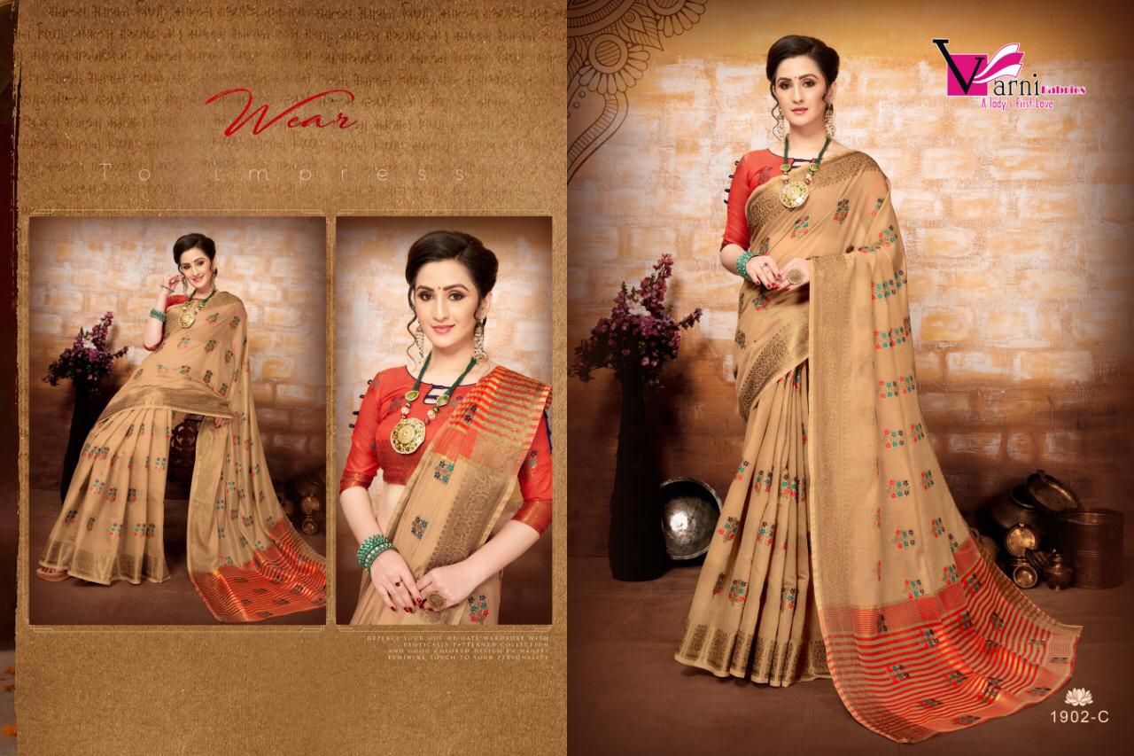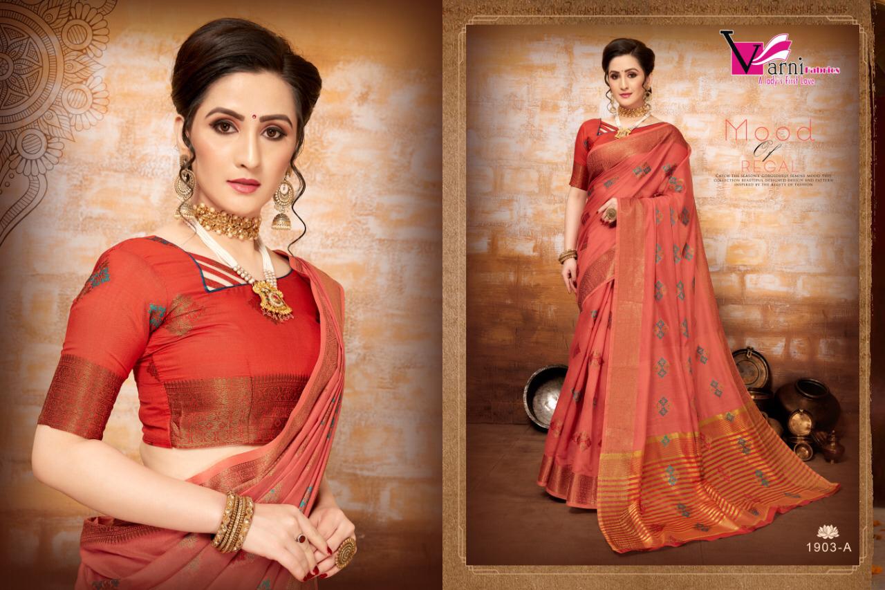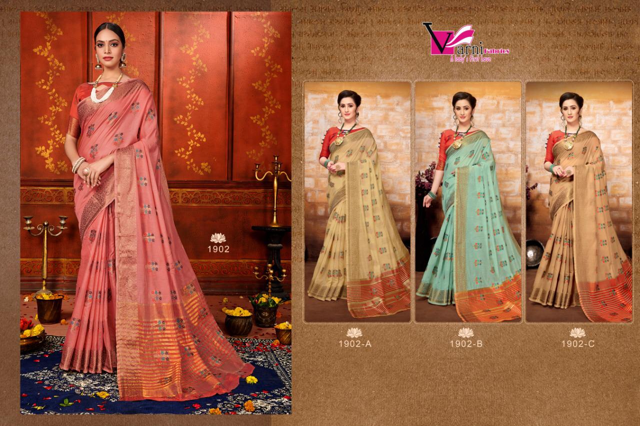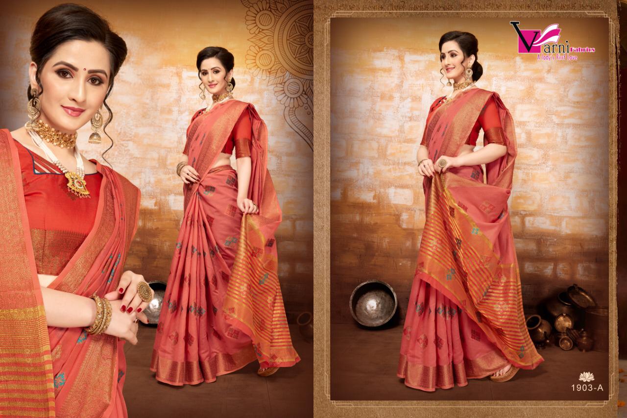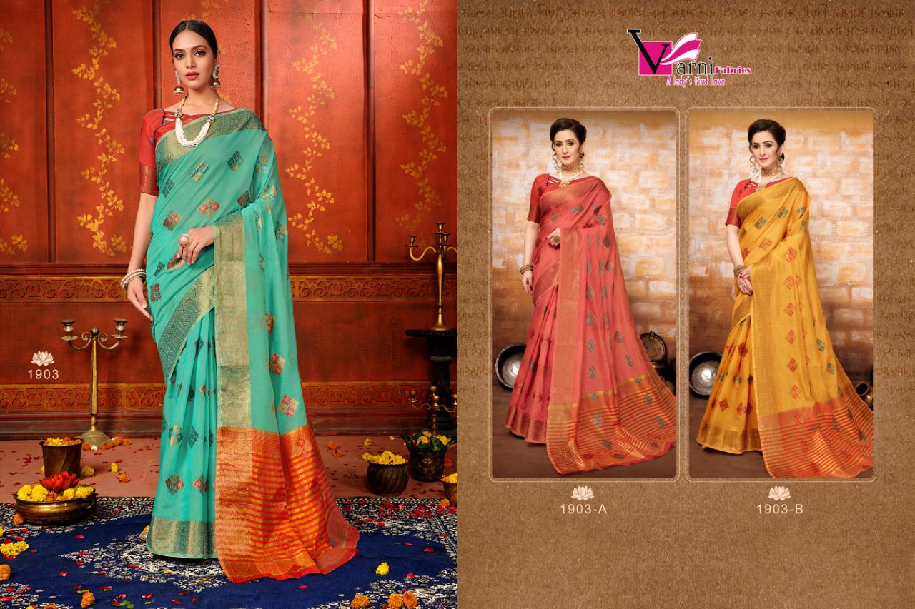 *New catalogue by Varni Fabrics* *Catalog Name : Nayantara silk Nx* *D. NO 1902 ORIGINAL + A / B / C* *D. NO 1903 ORIGINAL + A / B Colors* *Fabric : - Mina Art Silk* *7-Pic catalogue* *No Catalog Book, per pcs photo only* *? 650/-* *GST 5 Percent Extra* *SET OF 7 PCS* *Singles & Multiple pcs* *ALL DESIGNS Delivery From Today * |