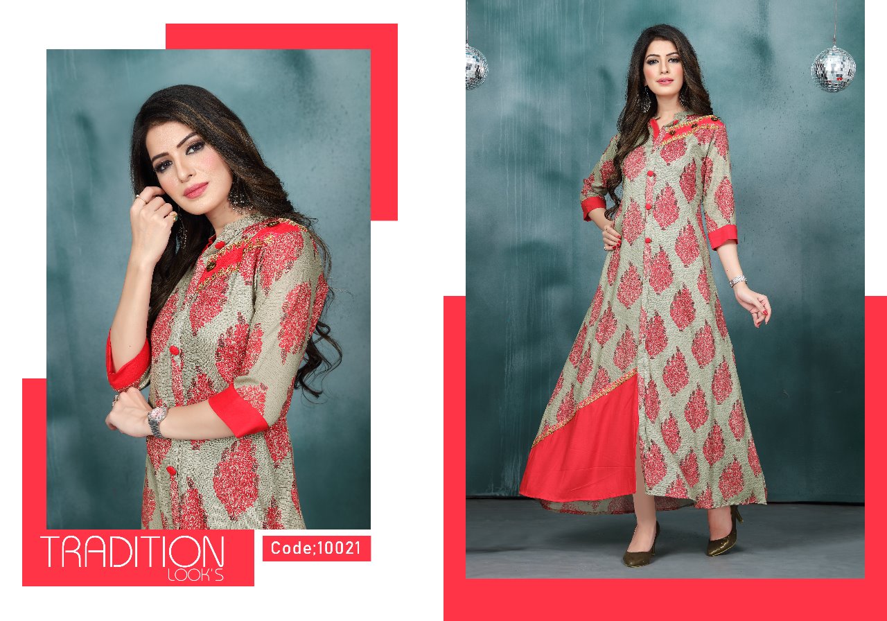 Catalouge name :- *Naysha* Brand name :- *NEETI* *Sizes:- L & XXL only* Length: 50"+ Fabric :- Heavy Reyon print and rayon plain with exclusive border concept Rate: 655.00 *Note :- 5 designs only* |