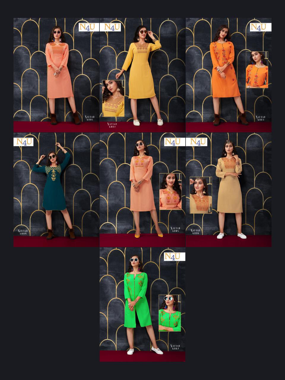 Buy Online Nayyab By N4u Reyon Kurtis Wholesale Supplier And Dealer Surat 7 Pcs of Full Catalogue at Wholesale Price. Looking for Nayyab By N4u Reyon Kurtis Wholesale Supplier And Dealer Surat Full Catalouge at Best Price? Buy Now Nayyab By N4u Reyon Kurtis Wholesale Supplier And Dealer Surat at Wholesale Rate of Rs 2653 with Total 7 Pcs from authroized dealer and supplier of BRAND'S Brand. Cost of Each piece is just only Rs 379 which is very low and affordable price to resale the product in your retail store ,This is Surat based Wholesale Supplier & Dealer of BRAND'S Brand. Click on Brand name to Know more about BRAND'S Brand's products.Call or Whatsapp on 9898838984 for booking or enquiry