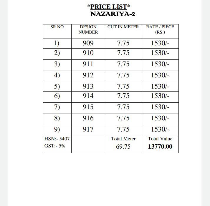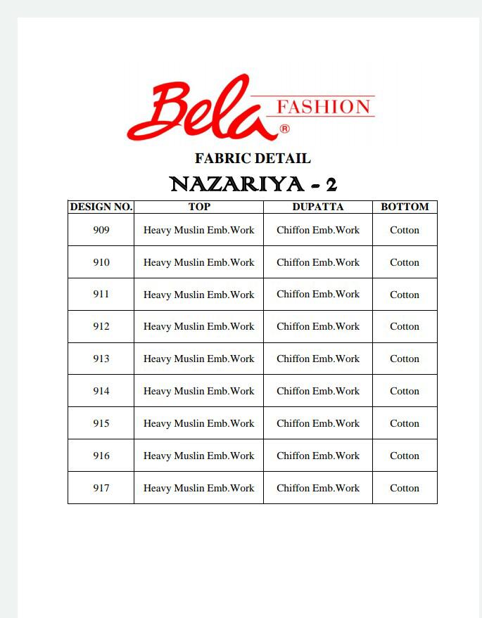 Buy Online Nazariya 2 By Bela Series 909 To 917 Designer Party Wear Suits Wholesale Supplier Gujarat 9 Pcs of Full Catalogue at Wholesale Price. Looking for Nazariya 2 By Bela Series 909 To 917 Designer Party Wear Suits Wholesale Supplier Gujarat Full Catalouge at Best Price? Buy Now Nazariya 2 By Bela Series 909 To 917 Designer Party Wear Suits Wholesale Supplier Gujarat at Wholesale Rate of Rs 13770 with Total 9 Pcs from authroized dealer and supplier of BELA Brand. Cost of Each piece is just only Rs 1530 which is very low and affordable price to resale the product in your retail store ,This is Surat based Wholesale Supplier & Dealer of BELA Brand. Click on Brand name to Know more about BELA Brand's products.Call or Whatsapp on 9898838984 for booking or enquiry