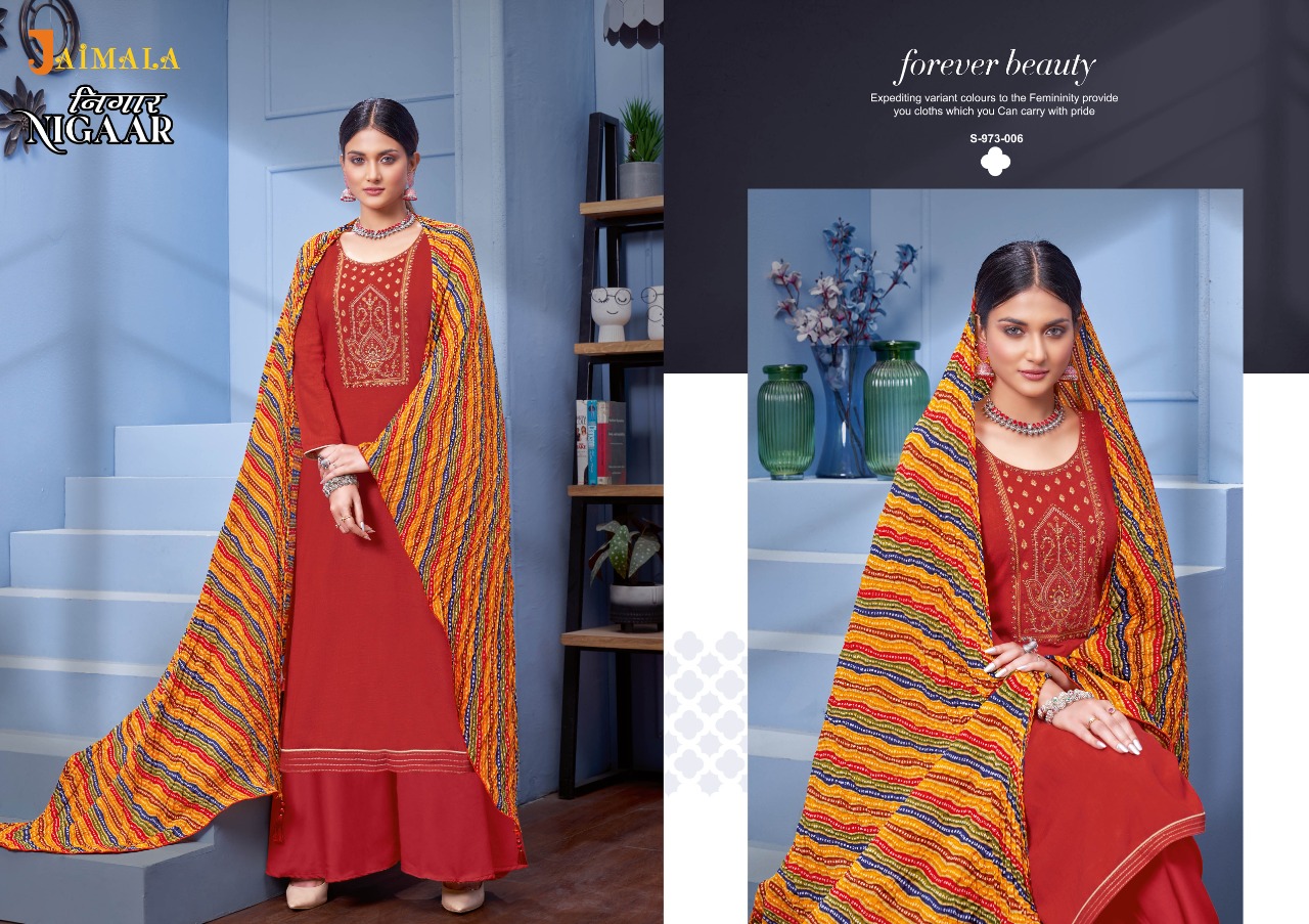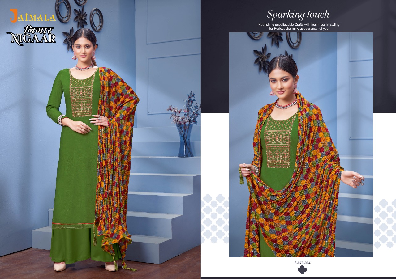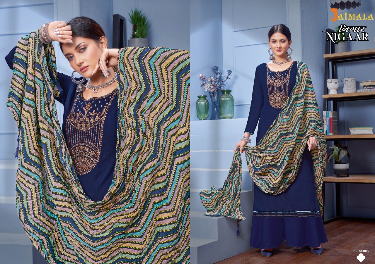 Buy Online Nigaar By Jalmala By Alok Suit Wholesale Supplier Traders In Surat 6 Pcs of Full Catalogue at Wholesale Price. Looking for Nigaar By Jalmala By Alok Suit Wholesale Supplier Traders In Surat Full Catalouge at Best Price? Buy Now Nigaar By Jalmala By Alok Suit Wholesale Supplier Traders In Surat at Wholesale Rate of Rs 3594 with Total 6 Pcs from authroized dealer and supplier of Brand. Cost of Each piece is just only Rs 599 which is very low and affordable price to resale the product in your retail store ,This is Surat based Wholesale Supplier & Dealer of Brand. Click on Brand name to Know more about Brand's products.Call or Whatsapp on 9898838984 for booking or enquiry