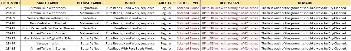 | Note | Stitching available on customer Requirment For Sarees , Salwar Kameez, Lehengha.(i.e M,L,XL,XXL). |