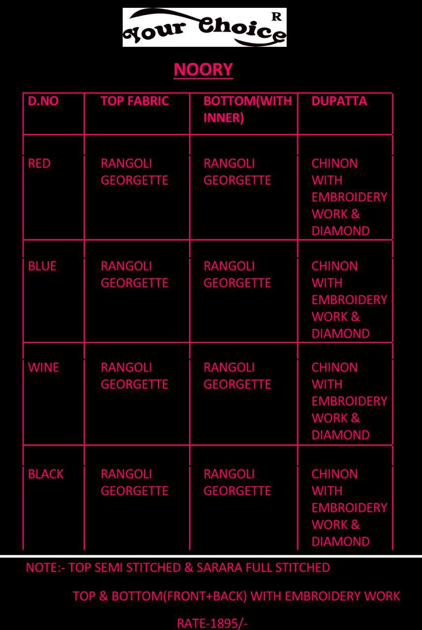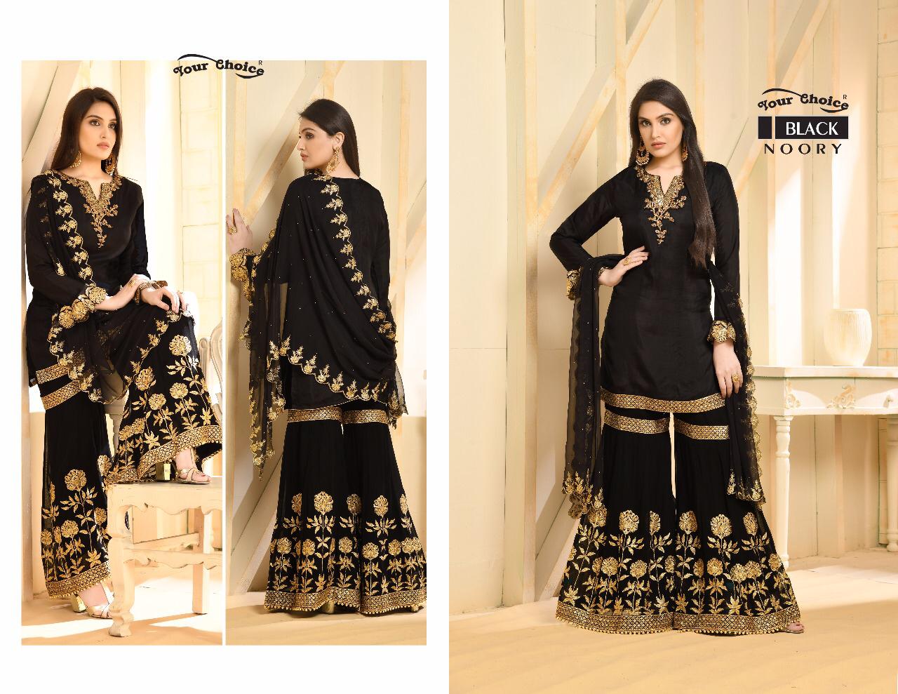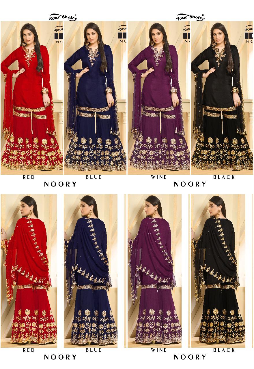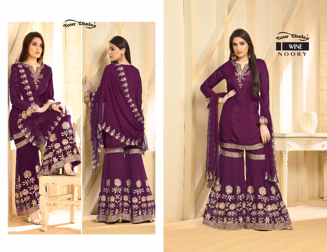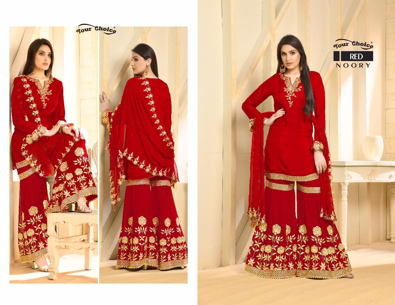 Buy Online Noory By Your Choice Fancy Designer Sarara Suit Collection Wholesaler Surat 4 Pcs of Full Catalogue at Wholesale Price. Looking for Noory By Your Choice Fancy Designer Sarara Suit Collection Wholesaler Surat Full Catalouge at Best Price? Buy Now Noory By Your Choice Fancy Designer Sarara Suit Collection Wholesaler Surat at Wholesale Rate of Rs 7580 with Total 4 Pcs from authroized dealer and supplier of YOUR CHOICE Brand. Cost of Each piece is just only Rs 1895 which is very low and affordable price to resale the product in your retail store ,This is Surat based Wholesale Supplier & Dealer of YOUR CHOICE Brand. Click on Brand name to Know more about YOUR CHOICE Brand's products.Call or Whatsapp on 9898838984 for booking or enquiry