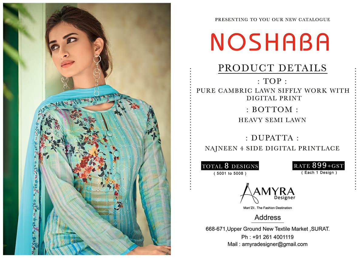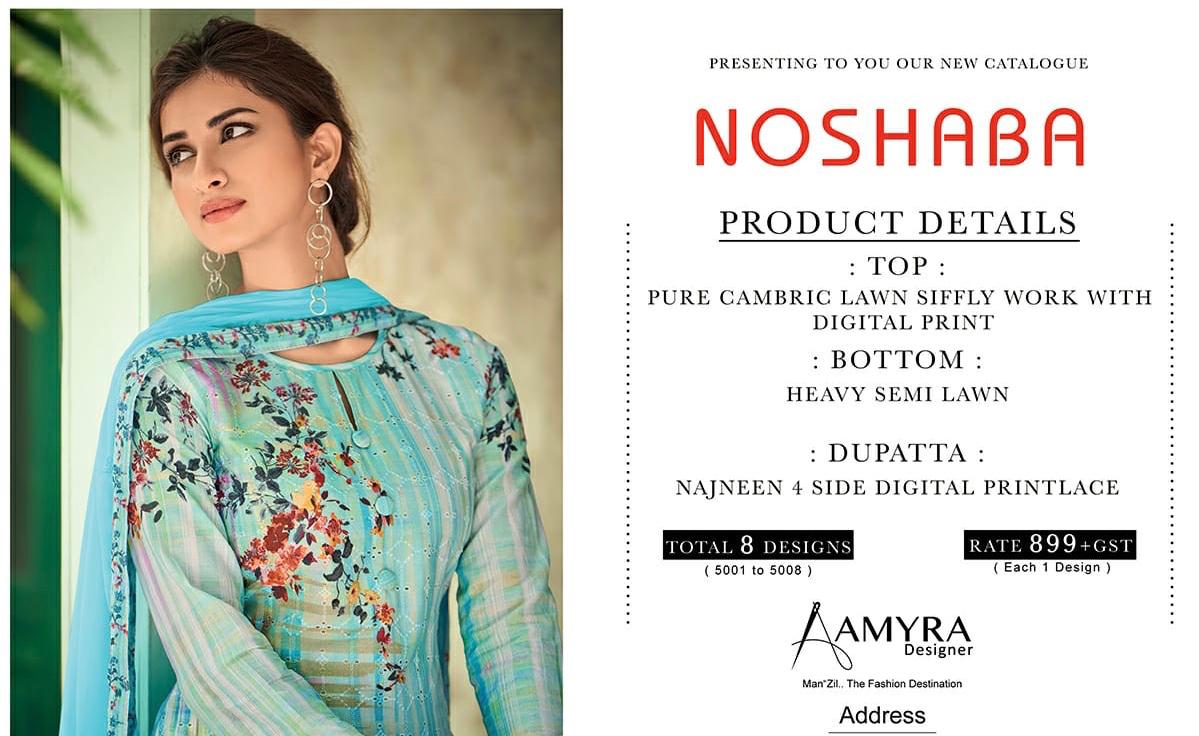 Buy Online Noshaba By Amyra Designer Series 5001 To 5008 Cambric Lawn Suits Wholesale Supplier Gujarat 8 Pcs of Full Catalogue at Wholesale Price. Looking for Noshaba By Amyra Designer Series 5001 To 5008 Cambric Lawn Suits Wholesale Supplier Gujarat Full Catalouge at Best Price? Buy Now Noshaba By Amyra Designer Series 5001 To 5008 Cambric Lawn Suits Wholesale Supplier Gujarat at Wholesale Rate of Rs 7192 with Total 8 Pcs from authroized dealer and supplier of Brand. Cost of Each piece is just only Rs 899 which is very low and affordable price to resale the product in your retail store ,This is Surat based Wholesale Supplier & Dealer of Brand. Click on Brand name to Know more about Brand's products.Call or Whatsapp on 9898838984 for booking or enquiry