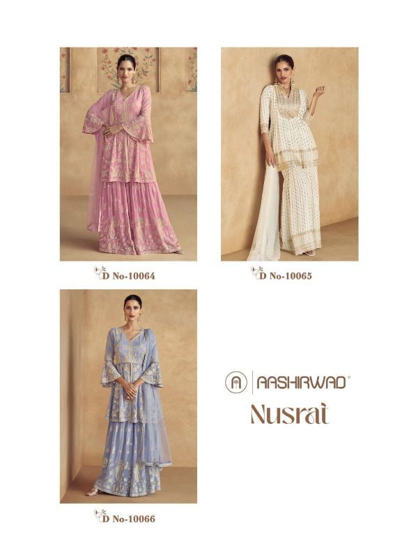 Buy Online Nusrat Series 10064 To 10066 By Aashirwad Plazzo Suits 3 Pcs of Full Catalogue at Wholesale Price. Looking for Nusrat Series 10064 To 10066 By Aashirwad Plazzo Suits Full Catalouge at Best Price? Buy Now Nusrat Series 10064 To 10066 By Aashirwad Plazzo Suits at Wholesale Rate of Rs 8397 with Total 3 Pcs from authroized dealer and supplier of AASHIRWAD Brand. Cost of Each piece is just only Rs 2799 which is very low and affordable price to resale the product in your retail store ,This is Surat based Wholesale Supplier & Dealer of AASHIRWAD Brand. Click on Brand name to Know more about AASHIRWAD Brand's products.Call or Whatsapp on 9898838984 for booking or enquiry