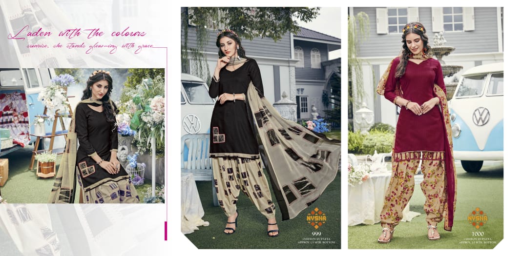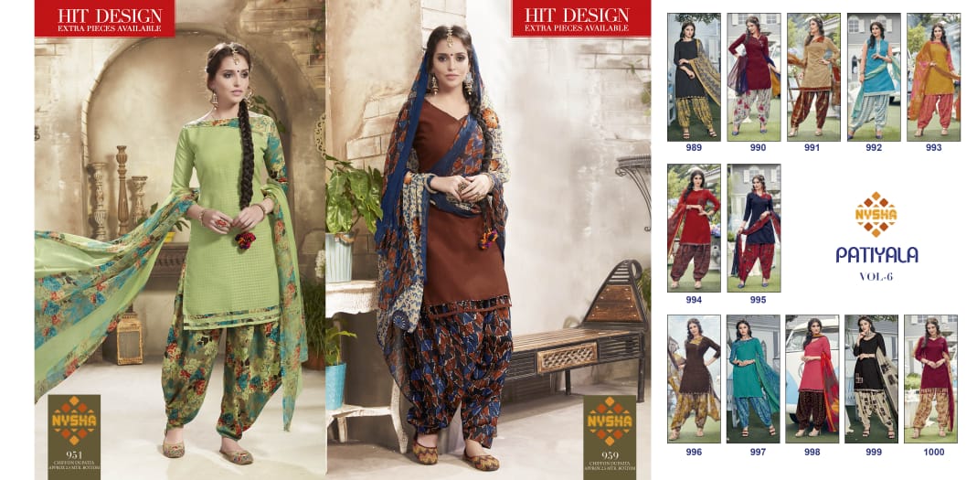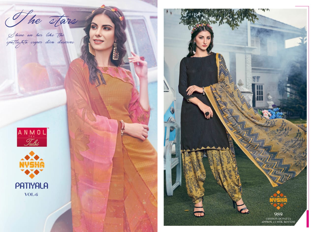 Buy Online Nysha Patiyala Vol 6 By Anmol Tex 989 Series Fancy Cotton Patiala Salwar Kameez Catlog Wholesale Dealer Surat 12 Pcs of Full Catalogue at Wholesale Price. Looking for Nysha Patiyala Vol 6 By Anmol Tex 989 Series Fancy Cotton Patiala Salwar Kameez Catlog Wholesale Dealer Surat Full Catalouge at Best Price? Buy Now Nysha Patiyala Vol 6 By Anmol Tex 989 Series Fancy Cotton Patiala Salwar Kameez Catlog Wholesale Dealer Surat at Wholesale Rate of Rs 3492 with Total 12 Pcs from authroized dealer and supplier of Brand. Cost of Each piece is just only Rs 291 which is very low and affordable price to resale the product in your retail store ,This is Surat based Wholesale Supplier & Dealer of Brand. Click on Brand name to Know more about Brand's products.Call or Whatsapp on 9898838984 for booking or enquiry