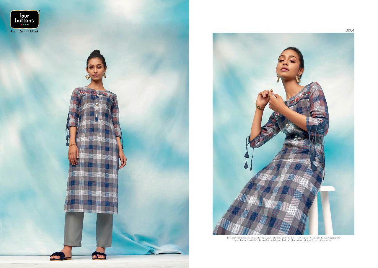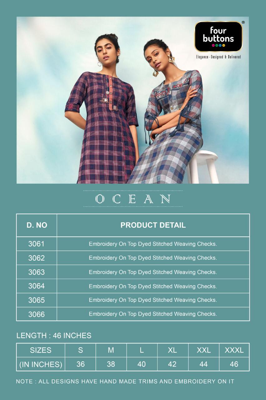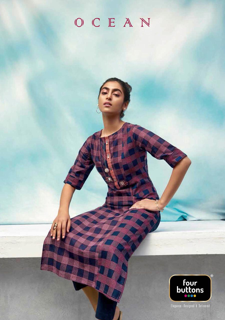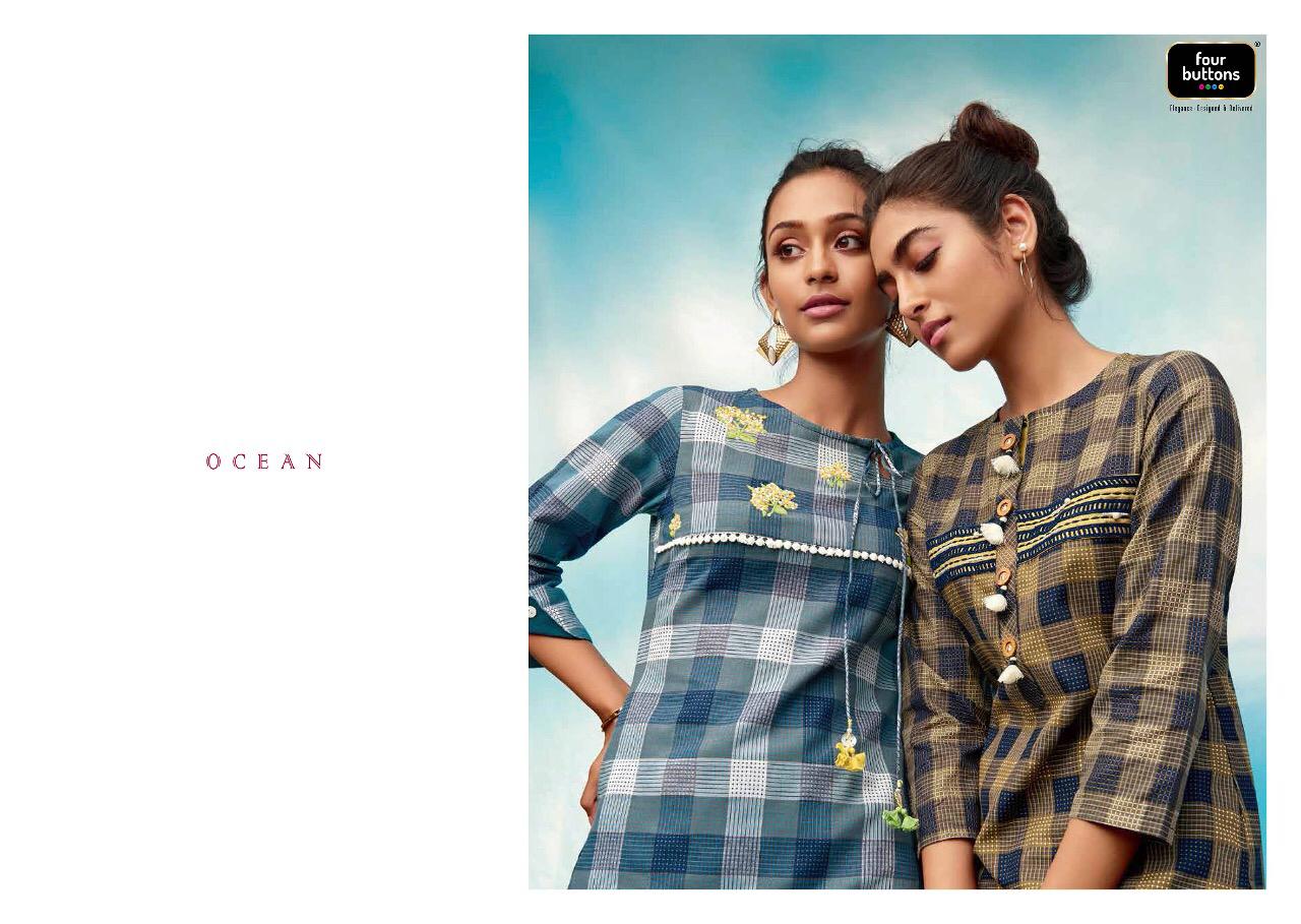 Buy Online Ocean By Four Buttons Cotton Kurtis Wholesale Supplier Surat 6 Pcs of Full Catalogue at Wholesale Price. Looking for Ocean By Four Buttons Cotton Kurtis Wholesale Supplier Surat Full Catalouge at Best Price? Buy Now Ocean By Four Buttons Cotton Kurtis Wholesale Supplier Surat at Wholesale Rate of Rs 4170 with Total 6 Pcs from authroized dealer and supplier of FOUR BUTTONS Brand. Cost of Each piece is just only Rs 695 which is very low and affordable price to resale the product in your retail store ,This is Surat based Wholesale Supplier & Dealer of FOUR BUTTONS Brand. Click on Brand name to Know more about FOUR BUTTONS Brand's products.Call or Whatsapp on 9898838984 for booking or enquiry